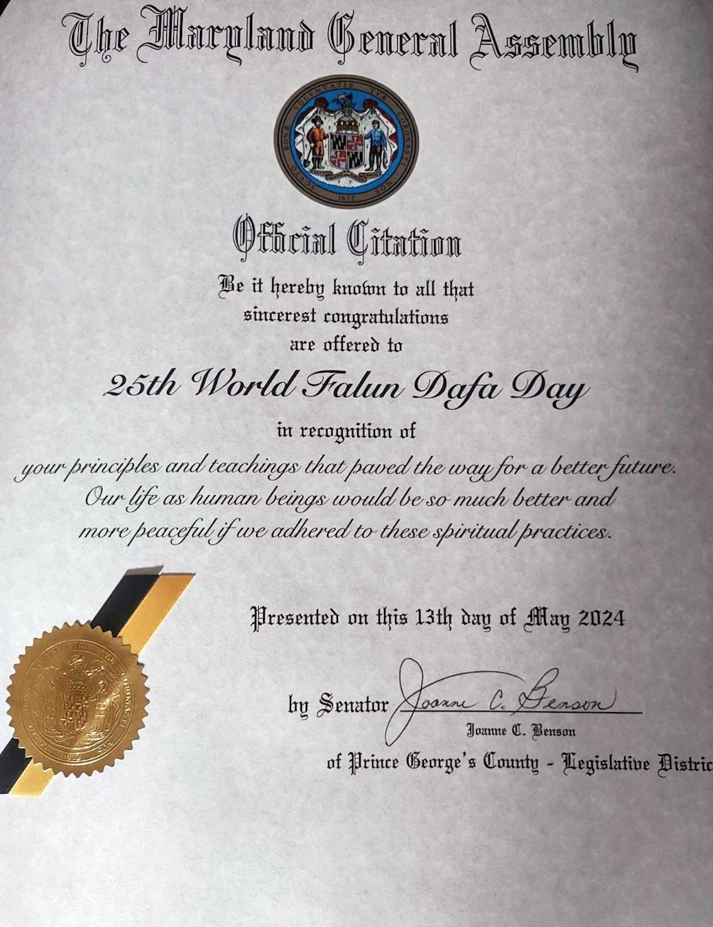 ![]() 圖1:美國馬裏蘭州參議員喬安妮﹒本森(Joanne Benson) | ![]() 圖2:慶祝法輪大法日之際,馬裏蘭州參議員喬安妮﹒本森(Joanne Benson)向法輪大法學會頒發褒獎證書。 |