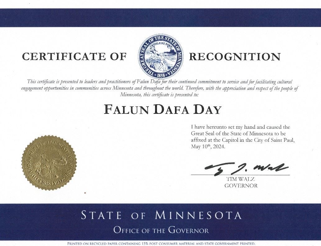 該證書頒發給法輪大法的創始人及修煉者們,以表彰他們繼續致力於為明尼蘇達州乃至世界各地的社區提供服務並促進文化交流的機會。因為他們受到明尼蘇達州人民的感激與尊重,特頒發此證書以表彰:世界法輪大法日