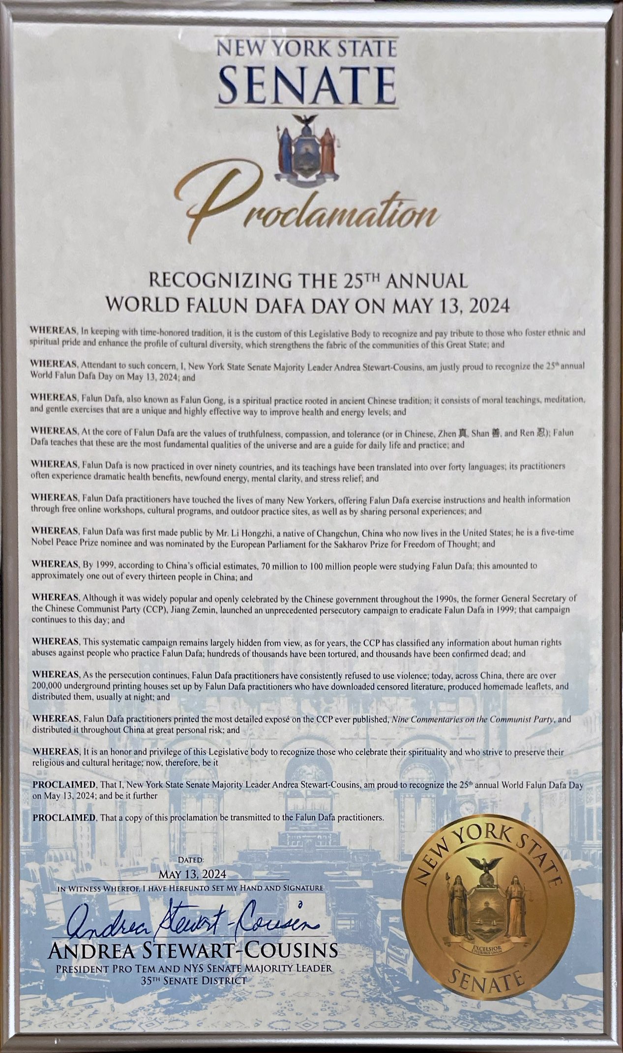 州參議院臨時議長、多數黨領袖、民主黨籍第三十五區議員安德烈埃﹒斯圖爾特-考辛斯(Andrea Stewart-Cousins)在慶祝第二十五屆世界法輪大法日的褒獎令中回顧說:
