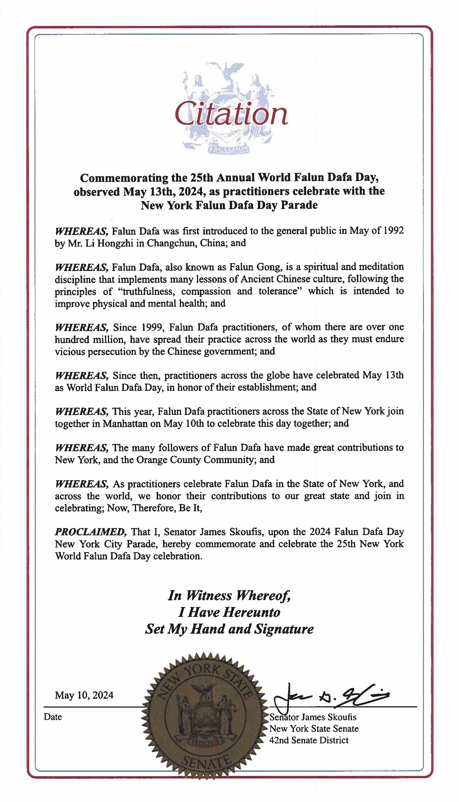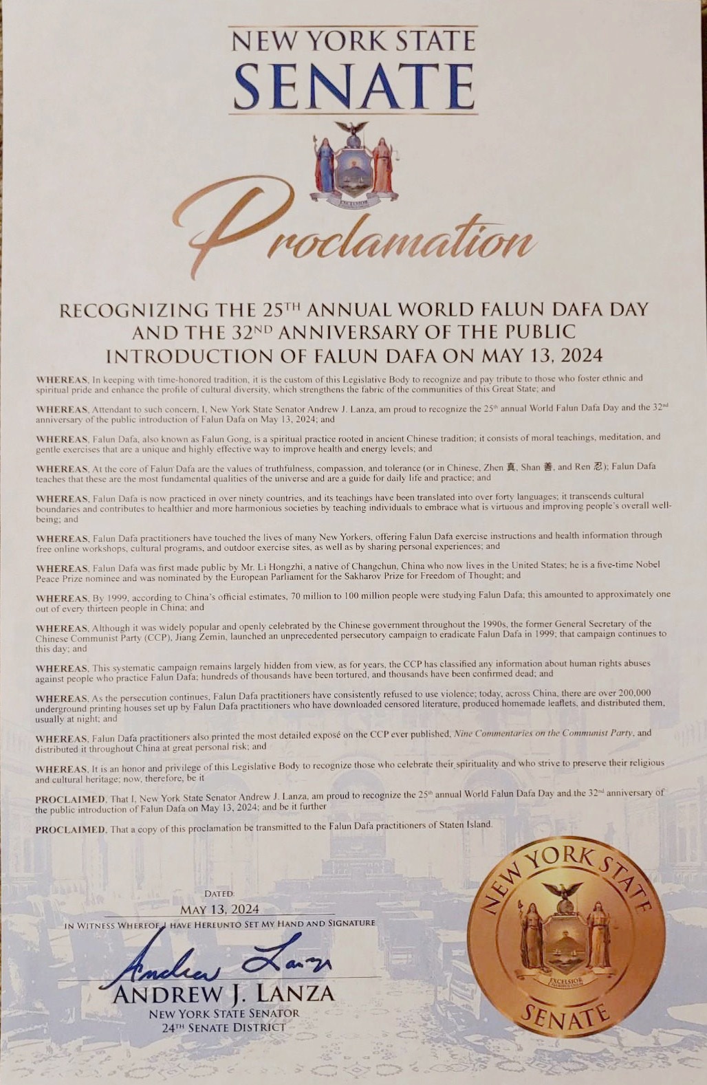 紐約州參議會於五月七日通過第2354號決議案,恭賀「二零二四年五月十三日第二十五屆世界法輪大法日」。這是紐約州參議院第十二年通過慶祝世界法輪大法日的決議。更有八位紐約州參議員向紐約法輪大法學會發來褒獎賀信慶祝5.13世界法輪大法日。