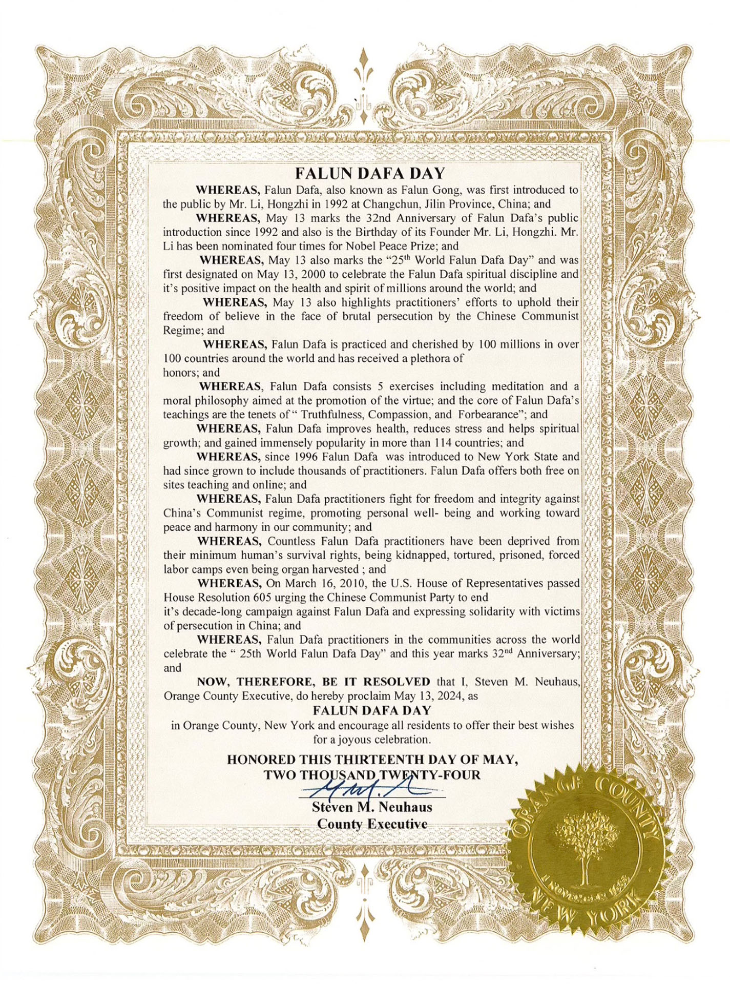 橙縣縣長史蒂文﹒紐豪斯(Steven M. Neuhaus)在「法輪大法日」褒獎令中表示:「五月十三日不僅是法輪大法弘傳三十二週年紀念日,也是創始人李洪志先生的生日,李先生曾五度獲得諾貝爾和平獎提名;這一天同時是世界法輪大法日,其設立,是為了慶祝法輪大法對全球民眾身心健康帶來的正面影響,亦突顯修煉者在中共殘酷迫害下堅守信仰自由的努力。」