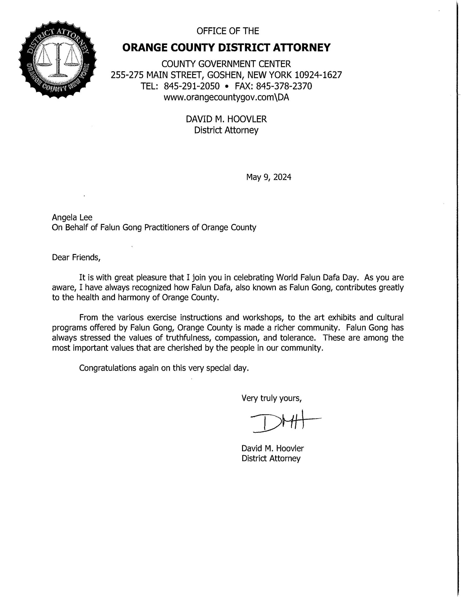 橙縣地區檢察官大衛﹒胡夫勒(DAVID M. HOOVLER)在賀信中說:「親愛的朋友們,我非常高興地與你們一起慶祝世界法輪大法日。正如你們所知,我一直認為法輪大法(又稱法輪功)為橙縣的健康與和諧做出了巨大貢獻。從法輪功的各種功法和功課,到法輪功提供的藝術展覽和文化活動,橙縣變得更加豐富多彩。法輪功一直強調真、善、忍的價值觀。這些都是我們社區的人們所珍視的最重要的價值觀之一。」