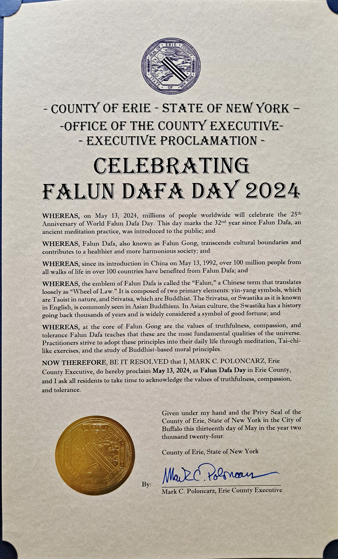 因此,我,伊利縣行政長官MARK C. POLONCARZ,謹此宣布二零二四年五月十三日為伊利縣的法輪大法日,並請所有居民花時間認可真善忍的價值。