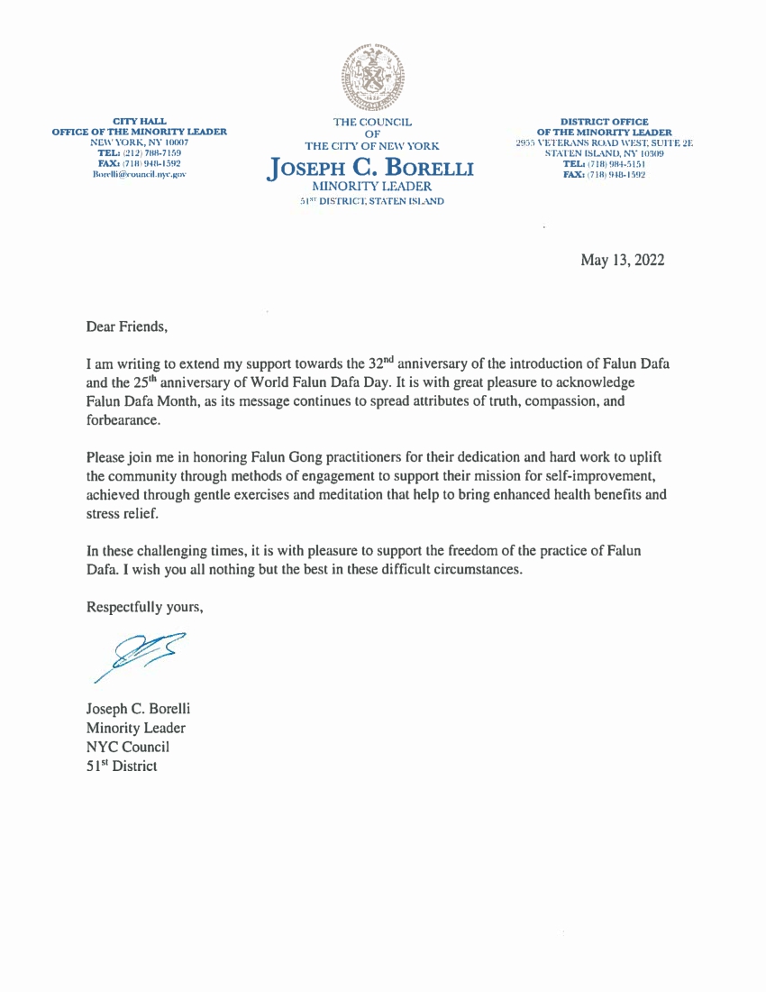 紐約市議會少數黨領袖、共和黨籍51選區市議員約瑟夫﹒博雷利(Joseph C.Borelli)在褒獎信中表示:「我寫信表達我對法輪大法弘傳三十二週年及第二十五屆世界法輪大法日的支持。鑑於他(大法)持續傳播真、善、忍的訊息,我滿懷欣喜褒獎法輪大法月。」