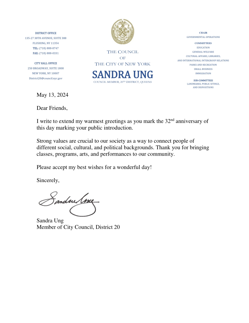 紐約市議會政府運作委員會主席黃敏儀(Sandra Ung)的第20選區覆蓋紐約市最大華人社區法拉盛。她在賀信中表示:「堅守價值觀對於我們社會的凝聚力至關重要,跨越不同的社會、文化與政治背景,將人們緊密相連。」