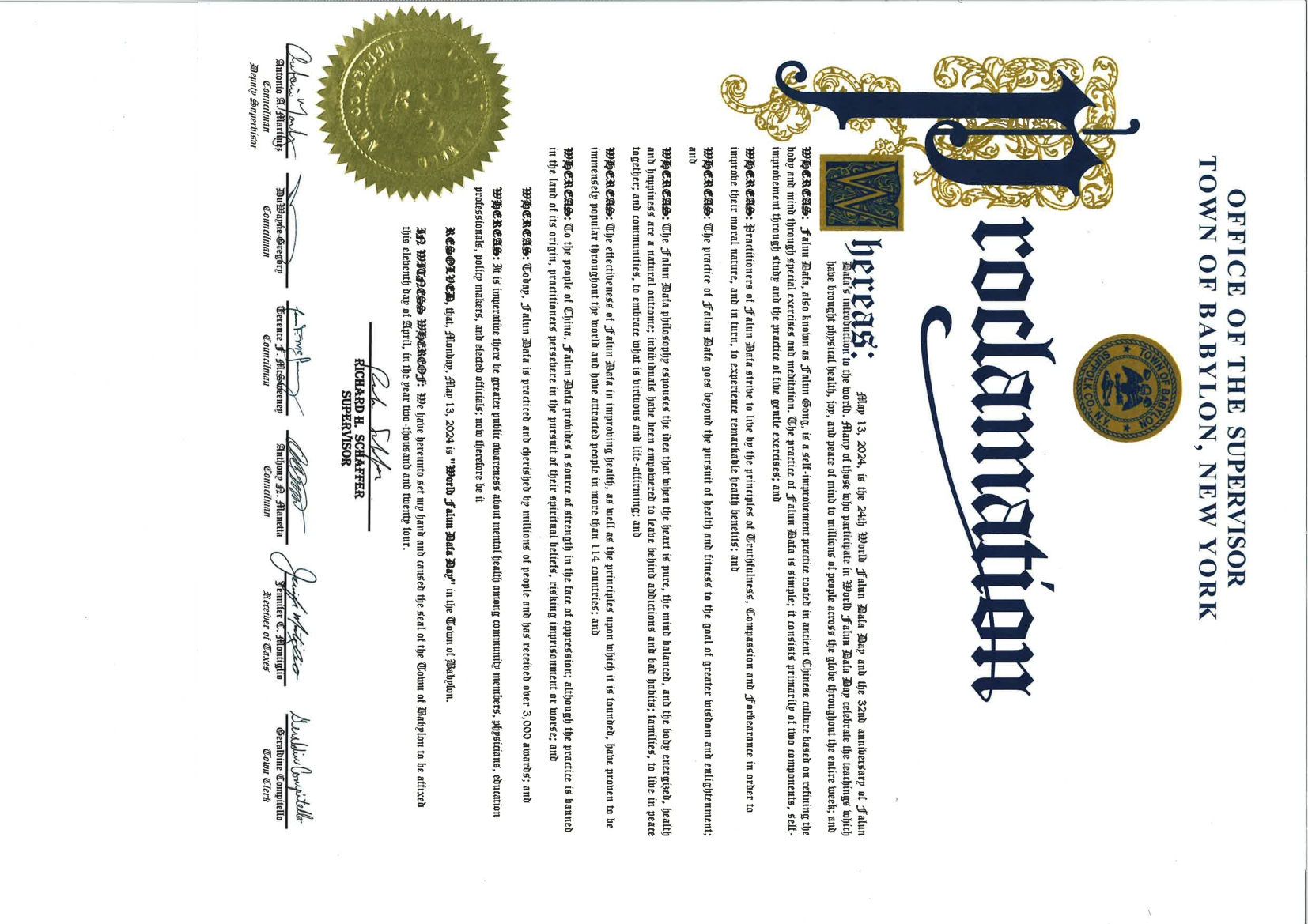 紐約長島巴比倫鎮(Town of Baylon)包括鎮長裏奇﹒謝弗(Rich Schaffer)、副鎮長安東尼奧﹒A﹒馬丁內斯(Antonio A. Martinez)、議員特倫斯﹒麥克斯威尼(Terence McSweeney)、安東尼﹒馬內塔(Anthony Manetta)和杜韋恩﹒格雷戈裏(DuWayne Gregory)等在內的全部七位鎮政府官員,褒獎二零二四年五月十三日是巴比倫鎮的世界法輪大法日。
