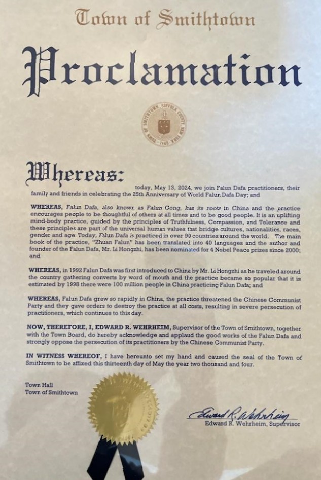 長島史密斯敦鎮(Town of Smithtown)鎮長愛德華﹒韋爾海姆(Edward R:Wehrheim)頒發褒獎,為法輪大法的傑出奉獻叫好;並強烈反對中共迫害法輪功學員。