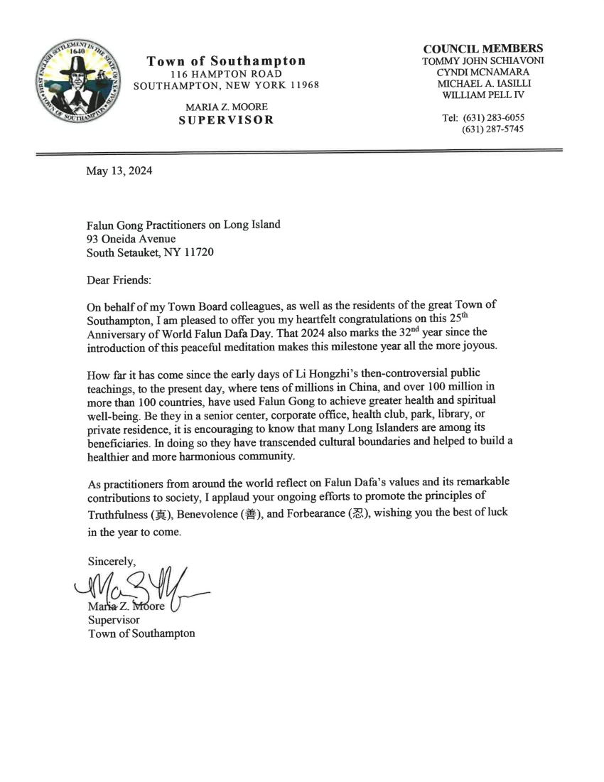 長島南安普敦鎮(Town of Southampton)鎮長瑪麗亞﹒摩爾(Maria Z. Moore)也發來賀信,讚揚學員們為弘揚 「真、善、忍」所做的不懈努力。 賀信中說