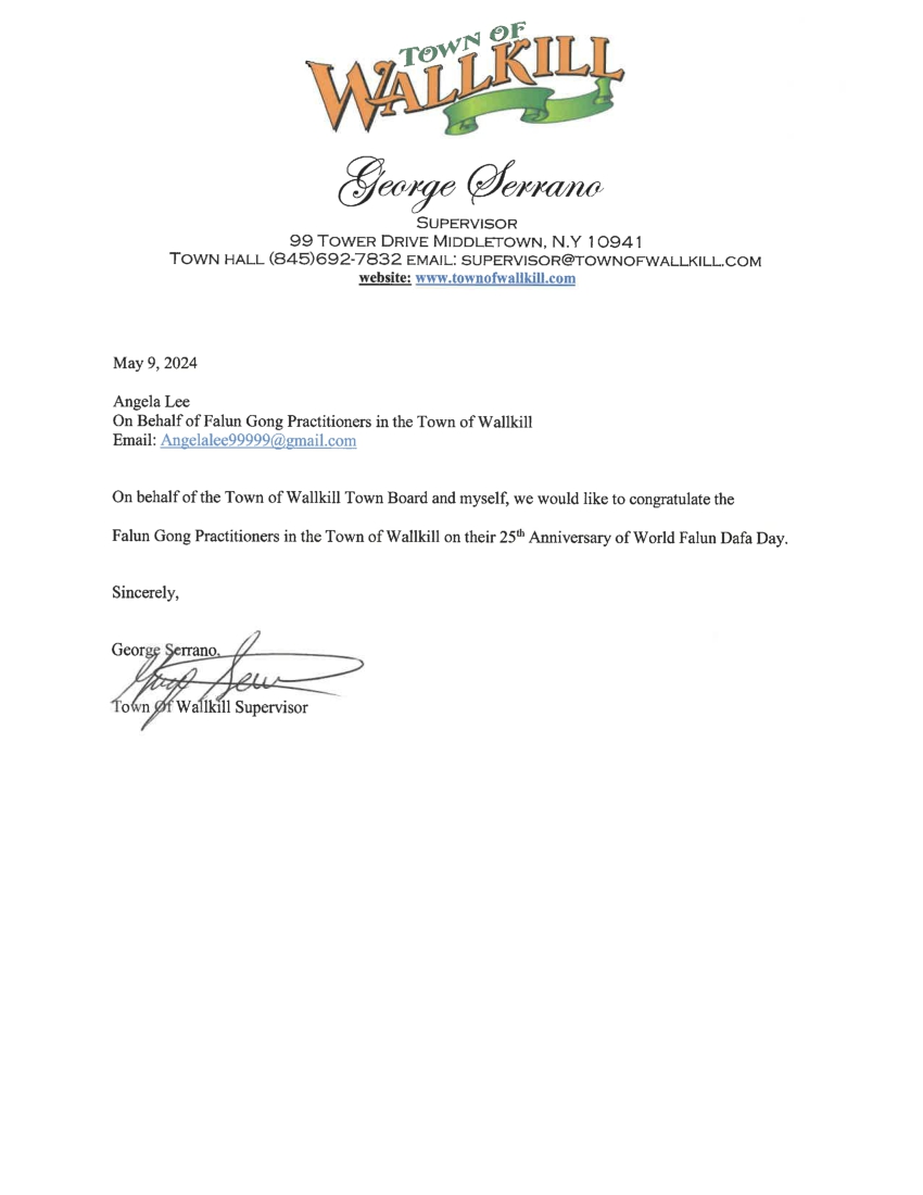 沃爾基爾鎮鎮長喬治﹒塞拉諾 (George Serrano) 發來賀信,表示:「我們代表沃爾基爾鎮鎮委會和我本人向沃爾基爾鎮法輪功學員祝賀。慶祝世界法輪大法日二十五週年。」