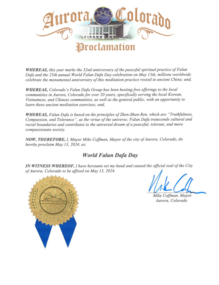 因此,我,科羅拉多州奧羅拉市市長邁克﹒科夫曼 ,特此宣布二零二四年五月十三日為世界法輪大法日。