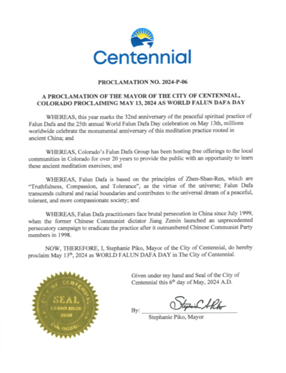 因此,現在,我,森特尼爾市市長斯蒂芬妮﹒皮科,特此宣布 二零二四年五月十三日為森特尼爾市世界法輪大法日。