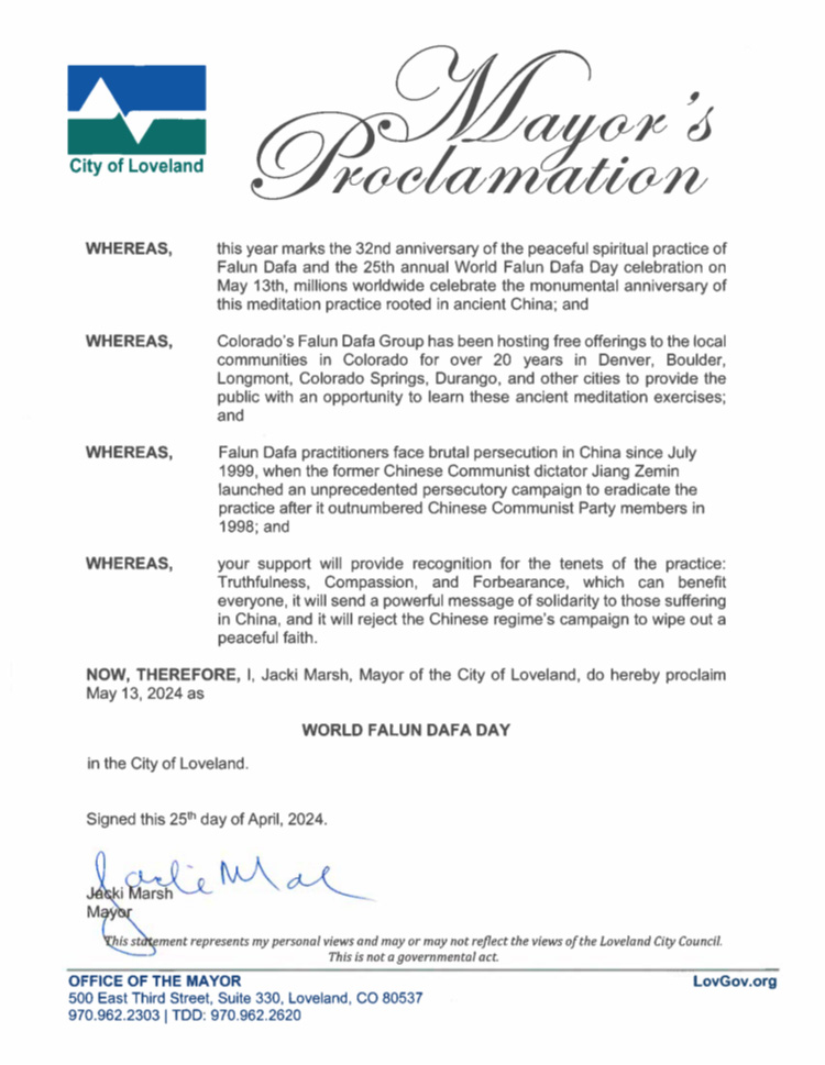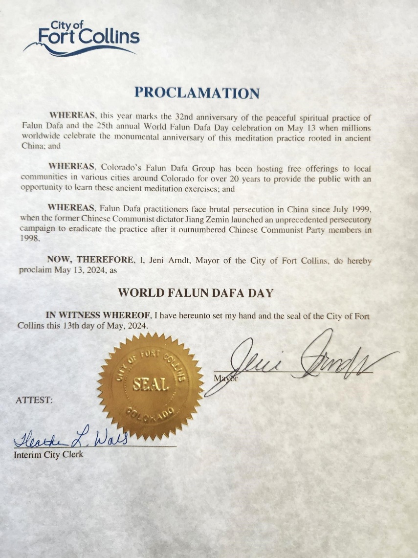 因此,現在,我,柯林斯堡市市長傑尼﹒阿恩特,特此宣布二零二四年五月十三日為世界法輪大法日。