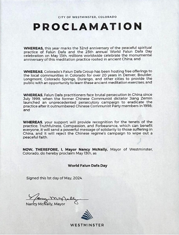 因此,現在,我,科羅拉多州威斯敏斯特市市長南希﹒麥克納利,特此宣布五月 十三日為世界法輪大法日。