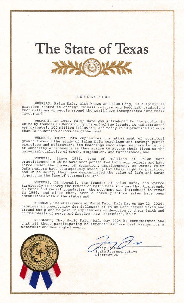 鑑於,二零二四年五月十三日是世界法輪大法日,來自德克薩斯州和全世界的法輪功修煉者將共襄盛舉,表達他們對信仰、和平與自由的奉獻;