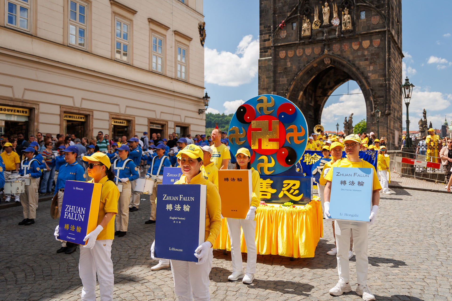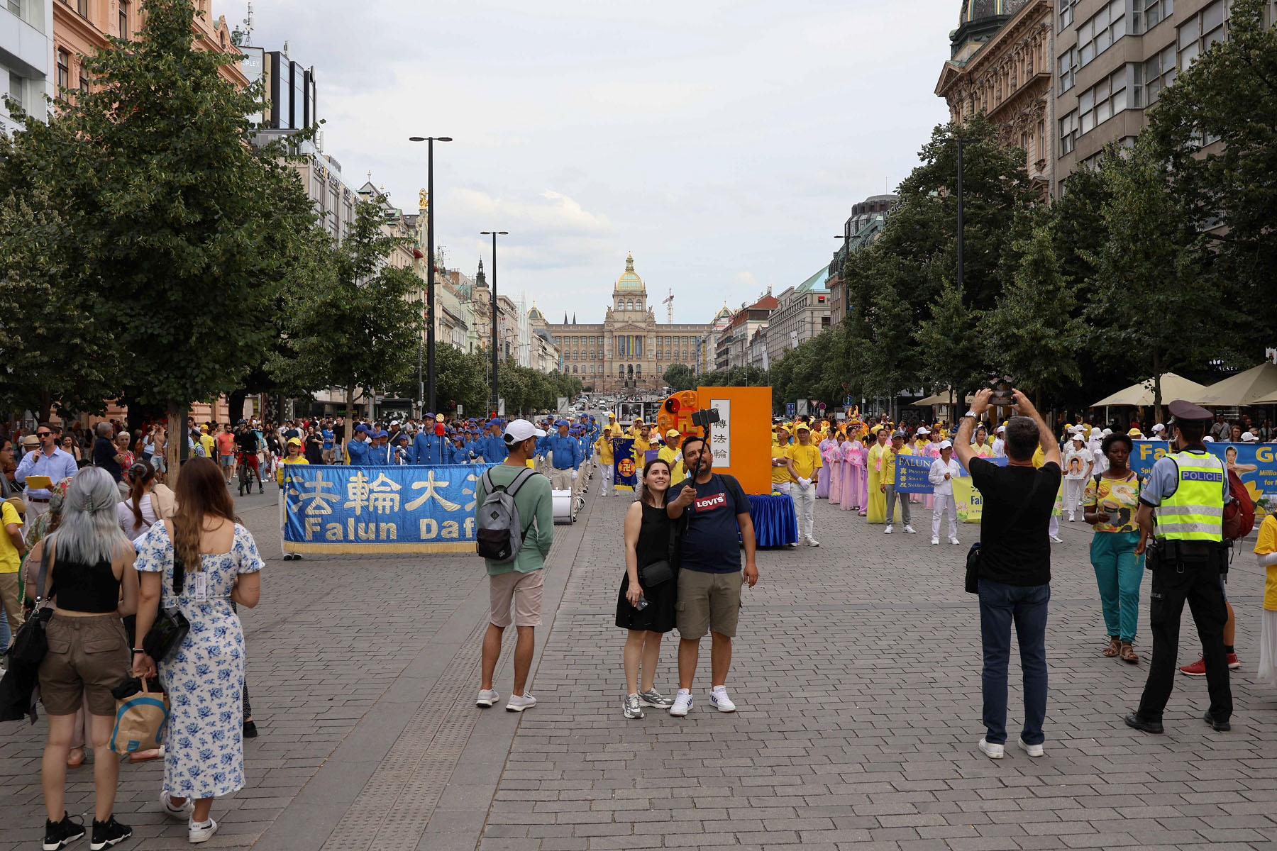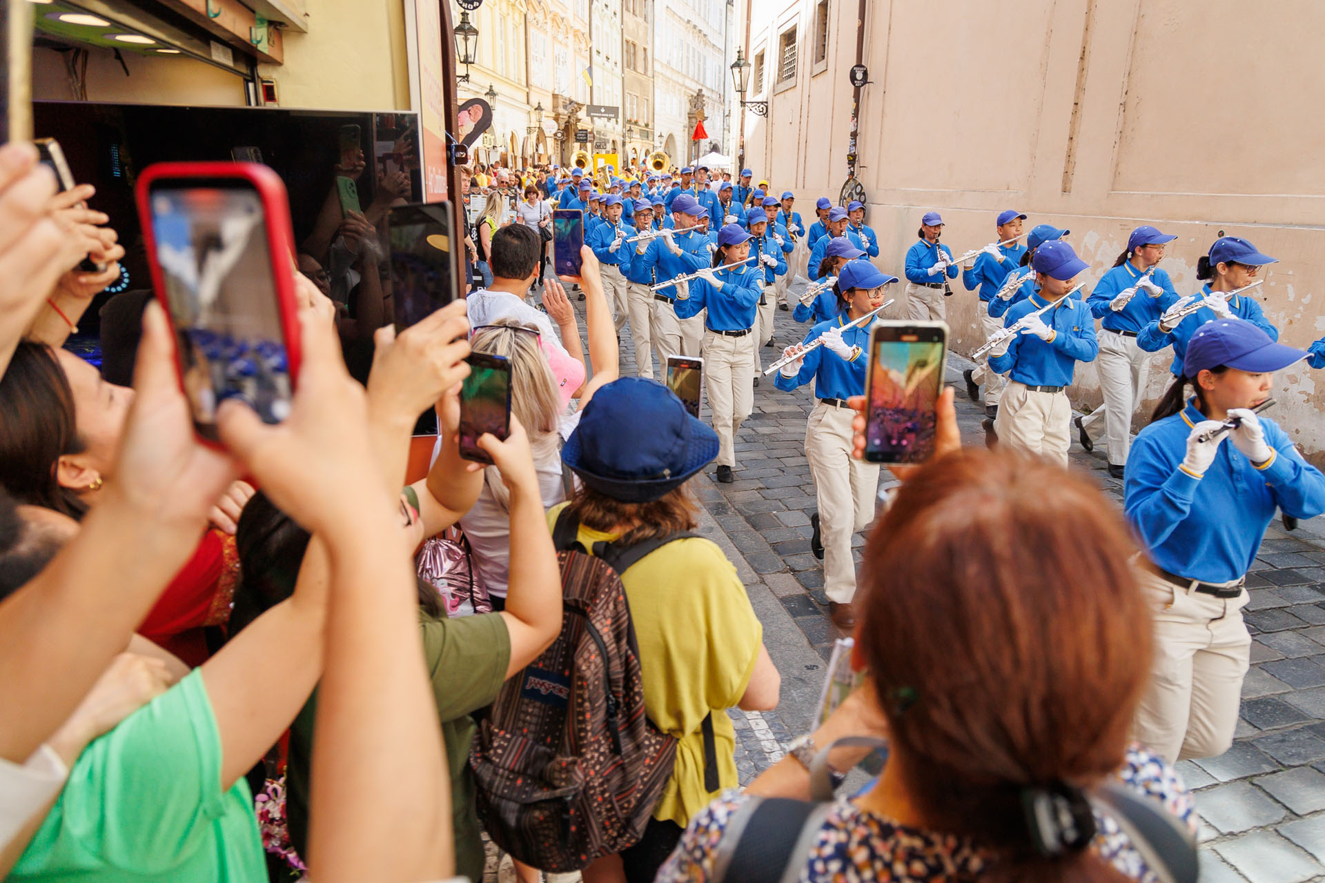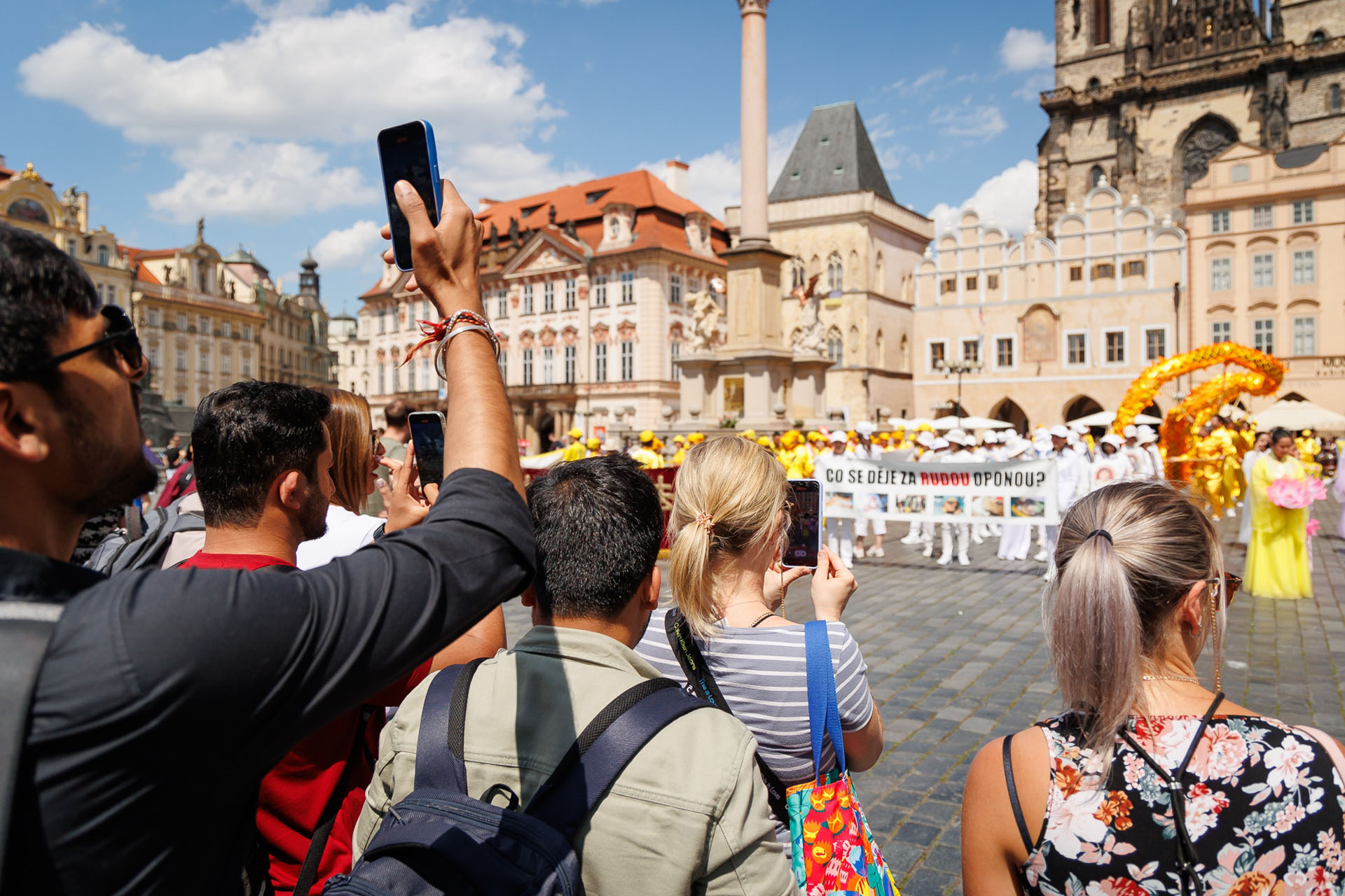 這支獨特的遊行隊伍,向遊客展示了布拉格的獨特風景,傳遞了前所未聞的全新訊息。有的遊客特意與煉功的學員、天國樂團軍樂隊、巨型的《轉法輪》模型及金色的真、善、忍橫幅合影留念。