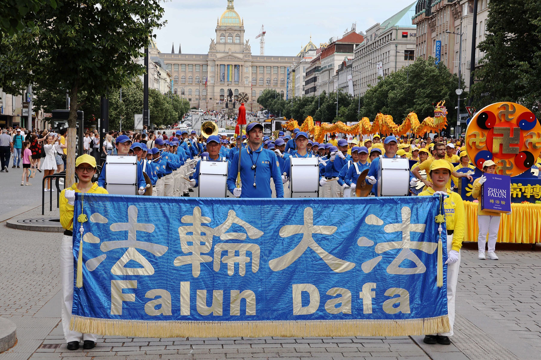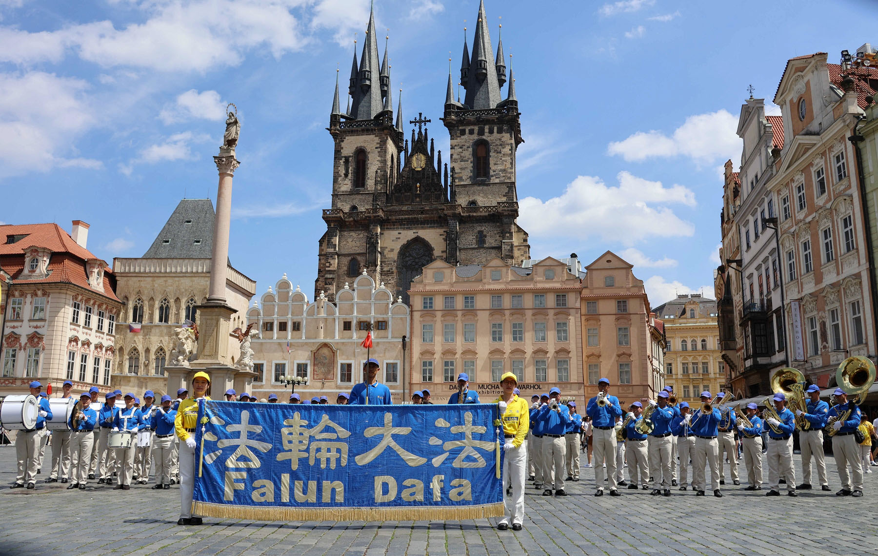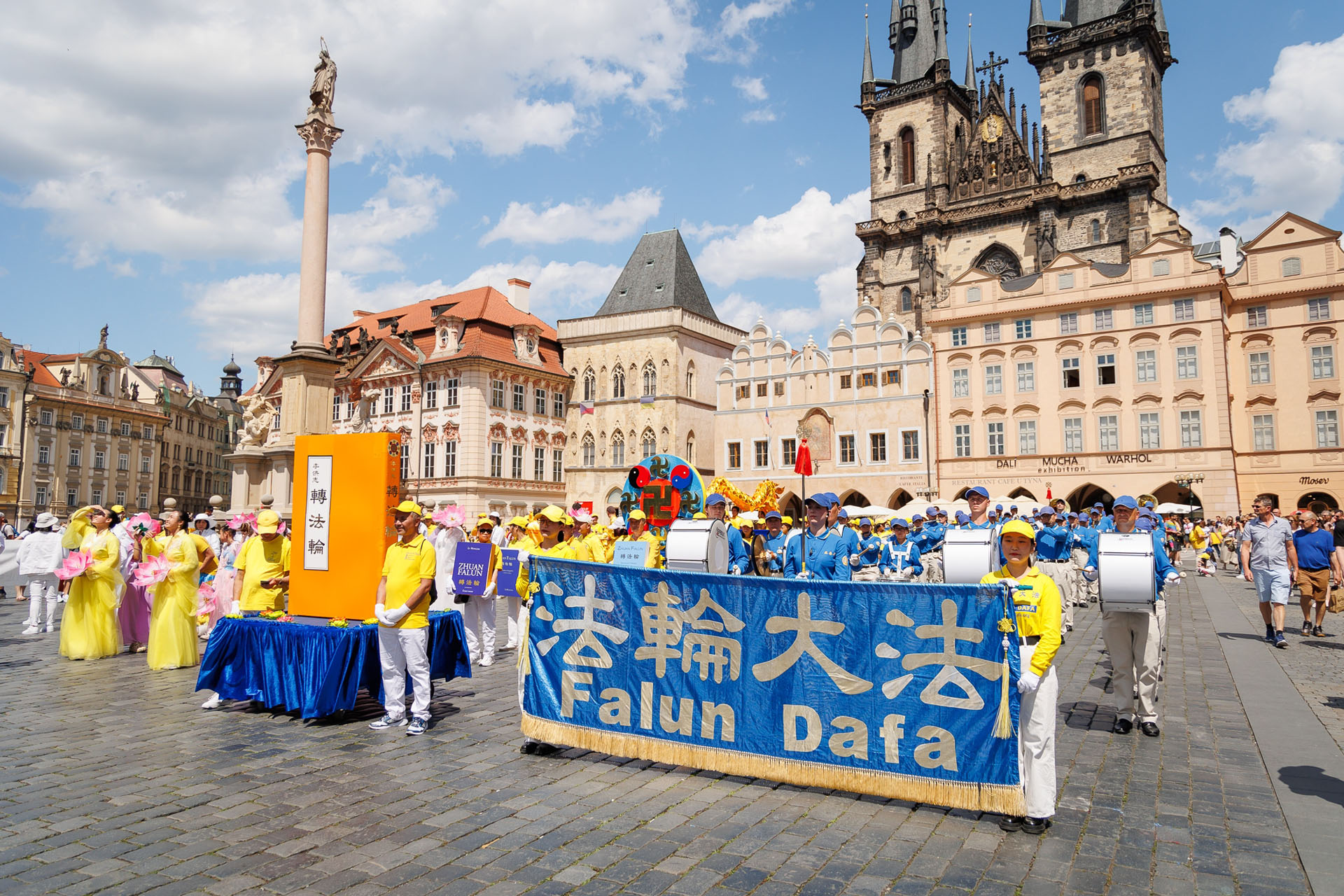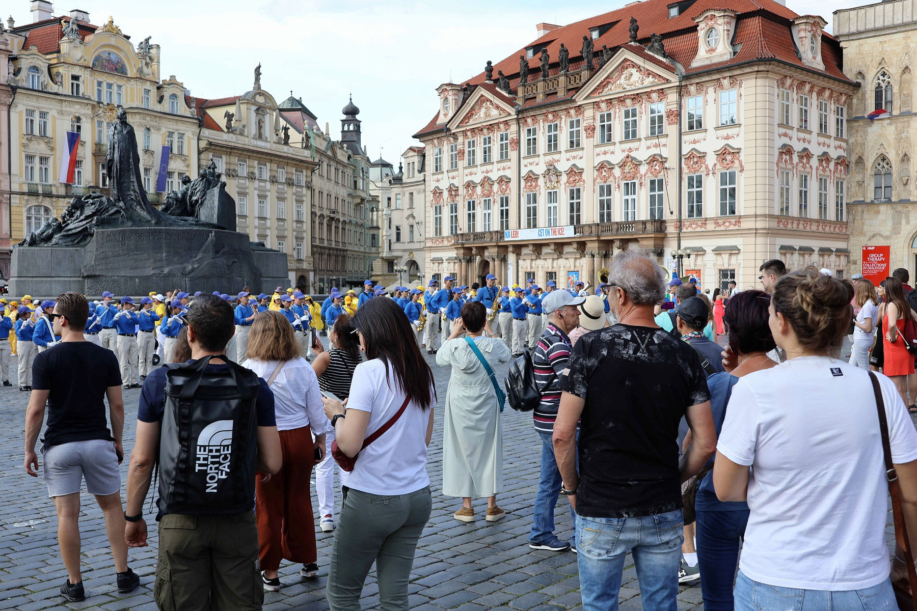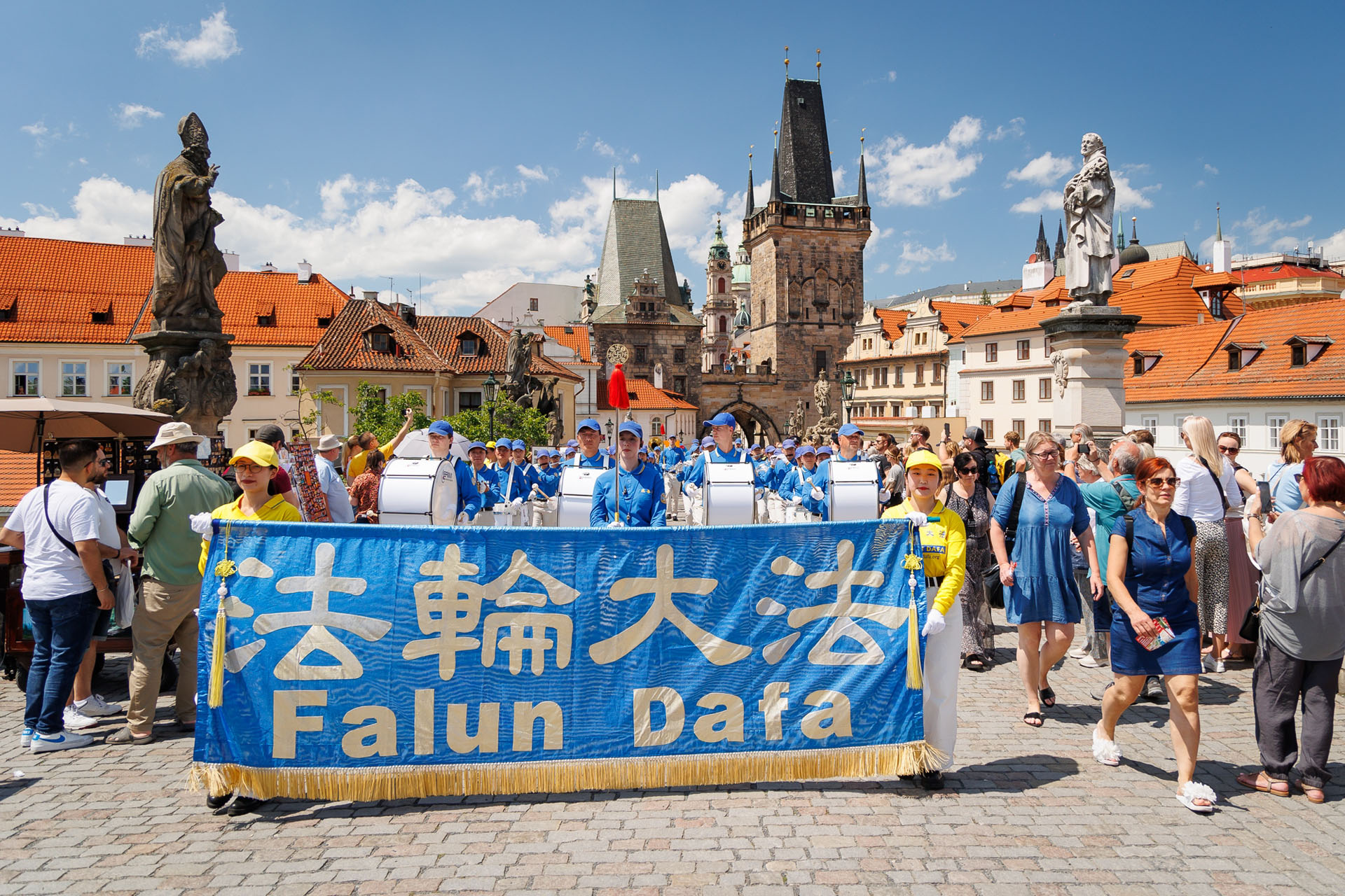 這支獨特的遊行隊伍,向遊客展示了布拉格的獨特風景,傳遞了前所未聞的全新訊息。有的遊客特意與煉功的學員、天國樂團軍樂隊、巨型的《轉法輪》模型及金色的真、善、忍橫幅合影留念。