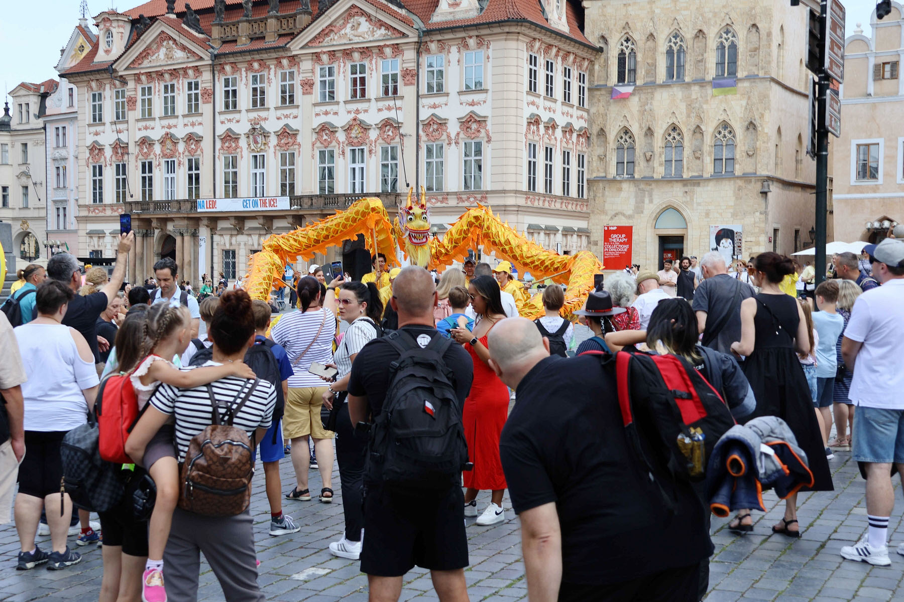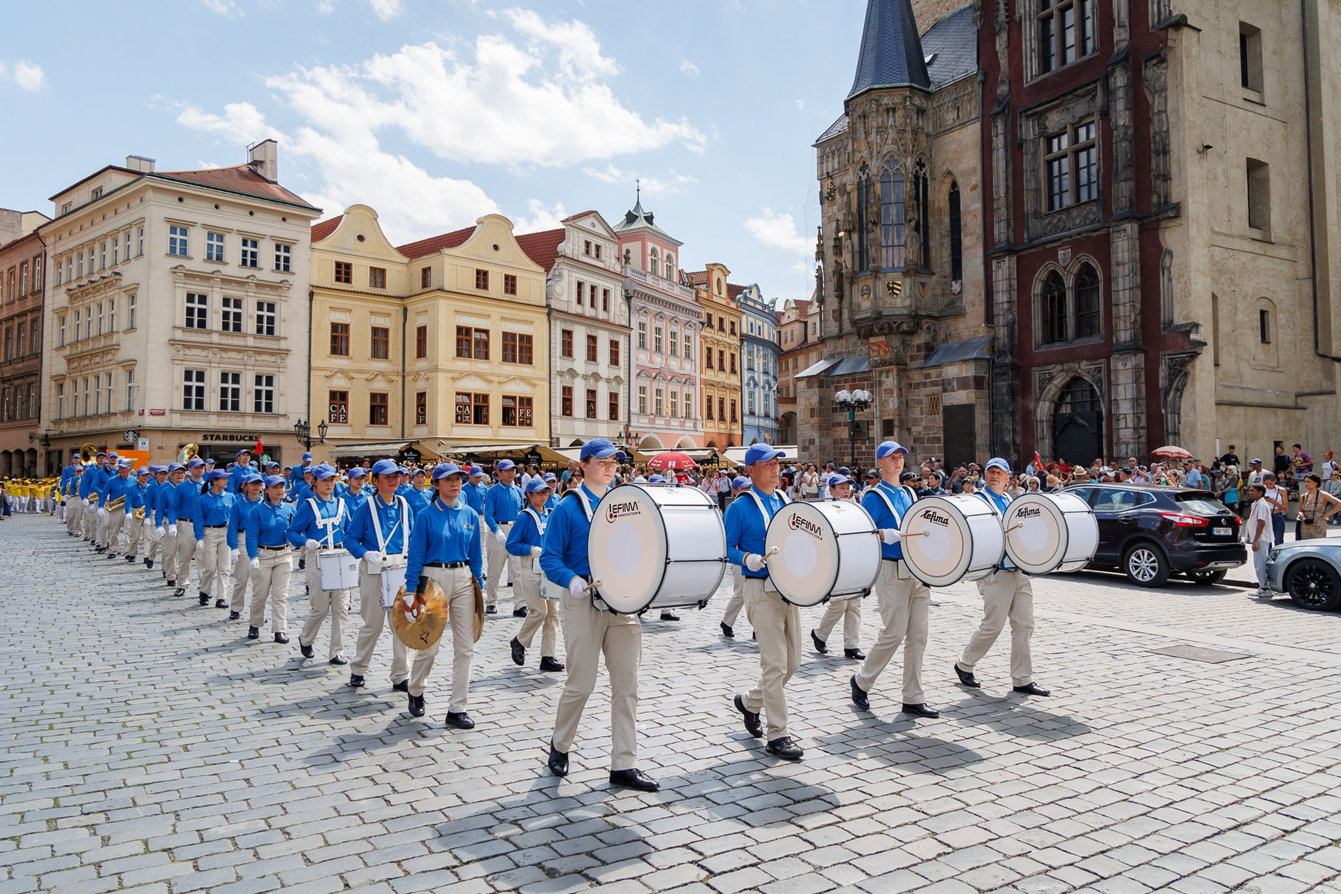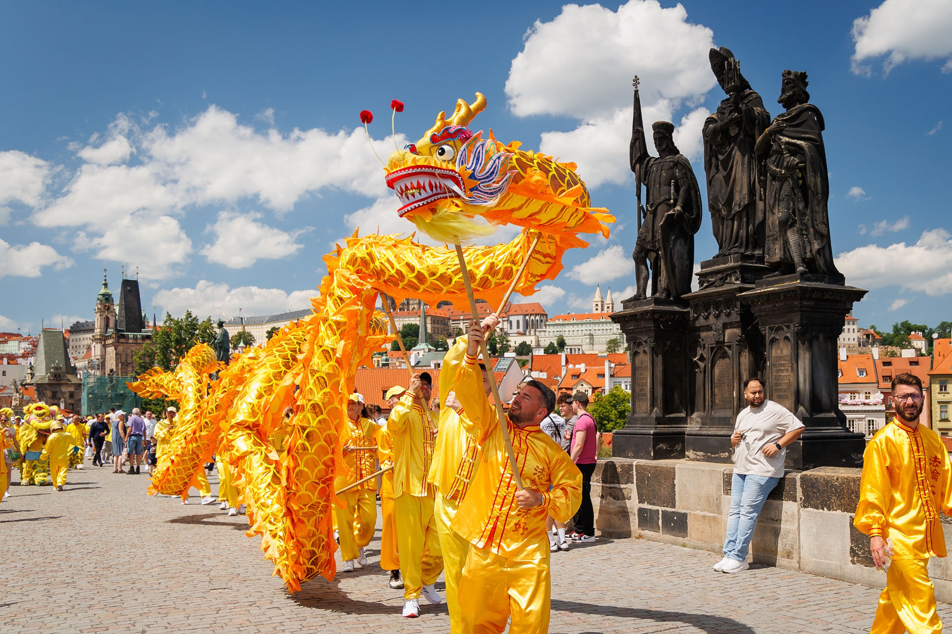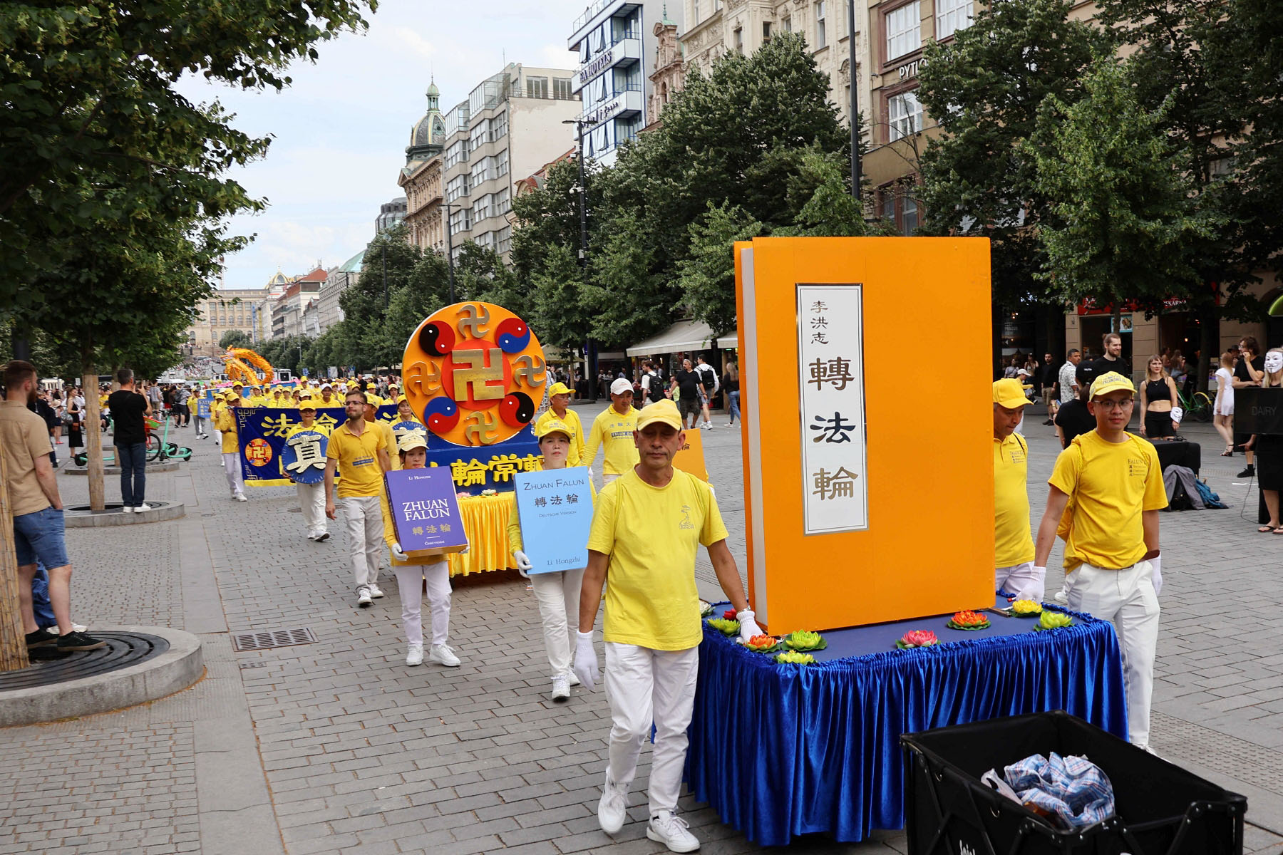 這支獨特的遊行隊伍,向遊客展示了布拉格的獨特風景,傳遞了前所未聞的全新訊息。有的遊客特意與煉功的學員、天國樂團軍樂隊、巨型的《轉法輪》模型及金色的真、善、忍橫幅合影留念。