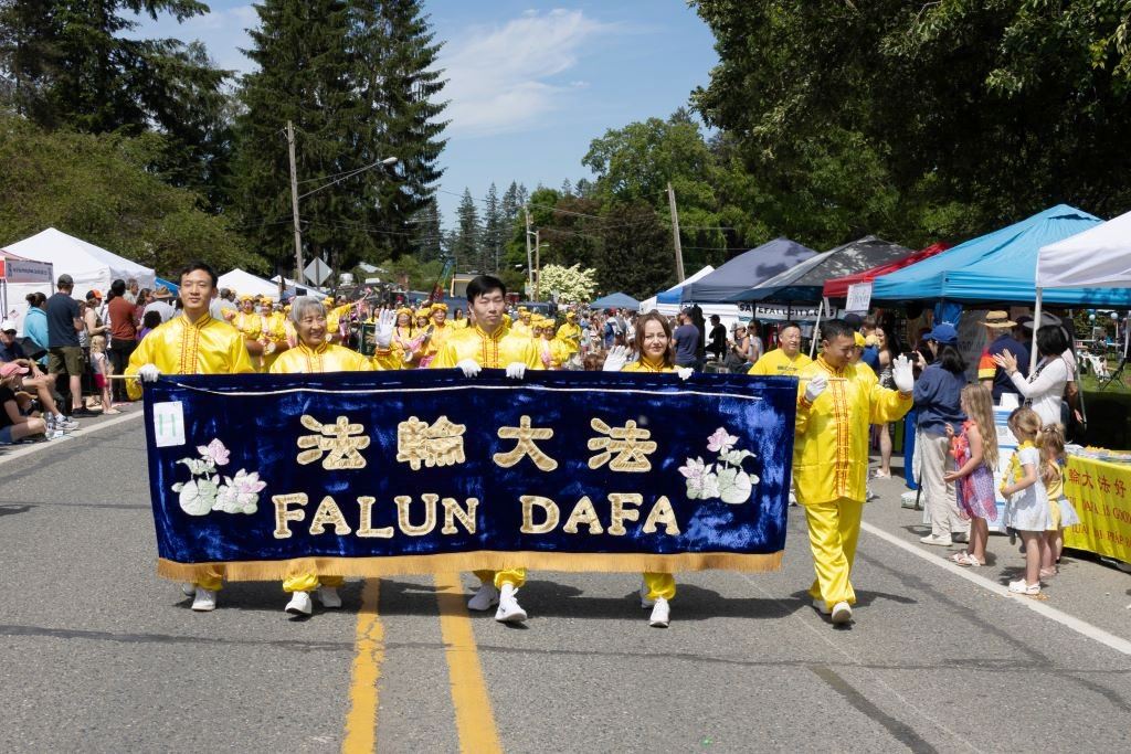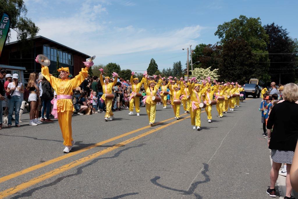 慶典當日,法輪功遊行隊伍的主體是由西雅圖法輪功學員和部份加拿大法輪功學員組成的腰鼓隊,伴隨著《法輪大法好》的旋律,腰鼓隊隊員們所敲打出的鼓聲整齊壯麗,他們的精彩表演讓觀眾深受感染,掌聲和歡呼聲此起彼伏。