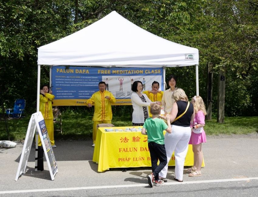 很多人在攤位前駐足,觀看功法演示,並和學員們交談,他們了解了法輪功學員們所遵循的真、善、忍原則,以及法輪功是讓人們身心受益、道德提升的修煉,並已經弘傳全球一百多個國家和地區。