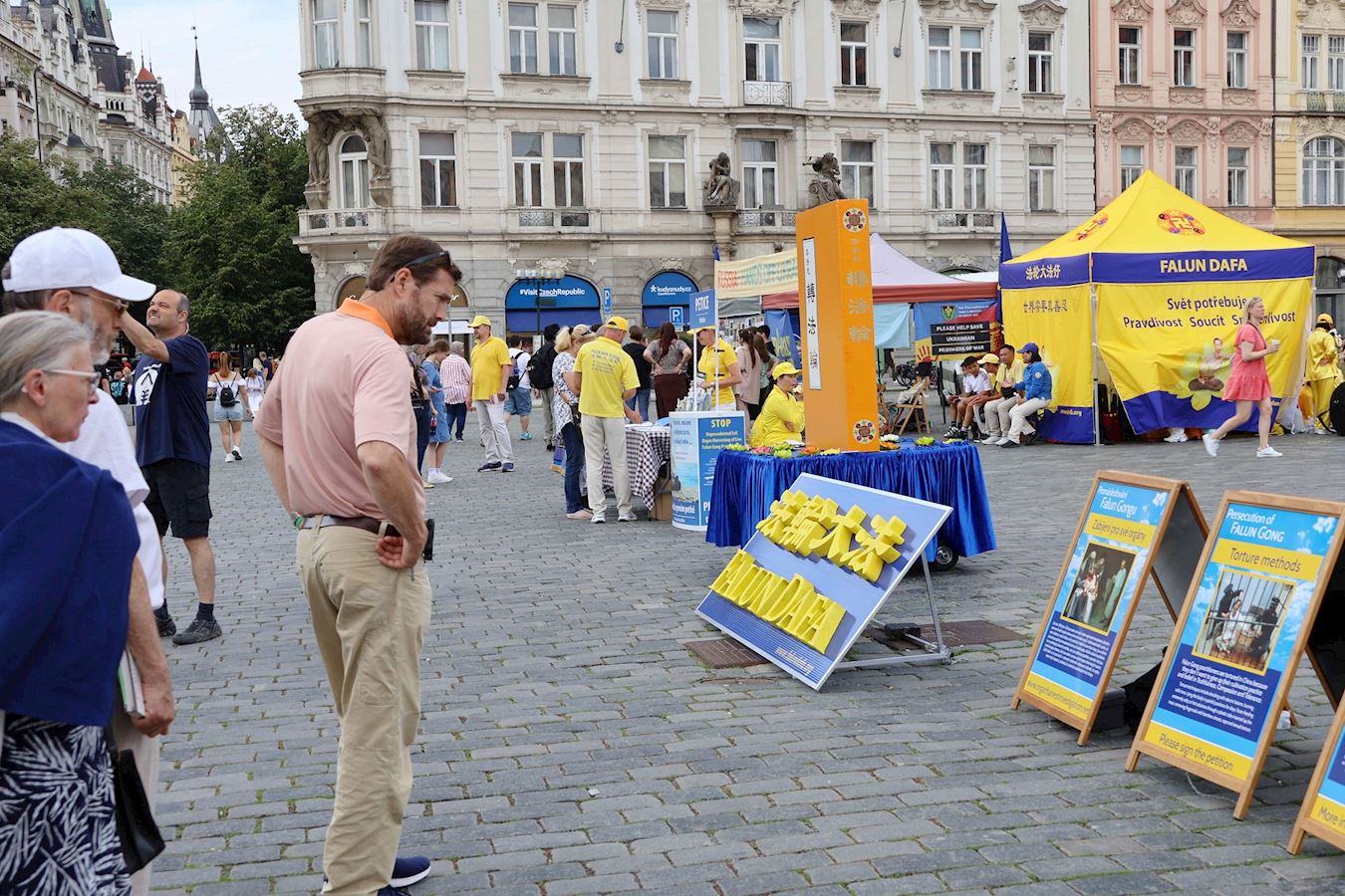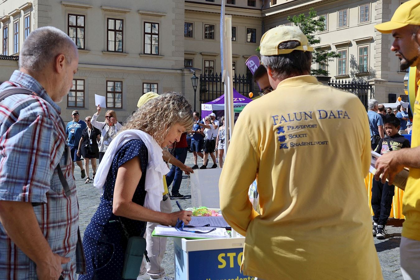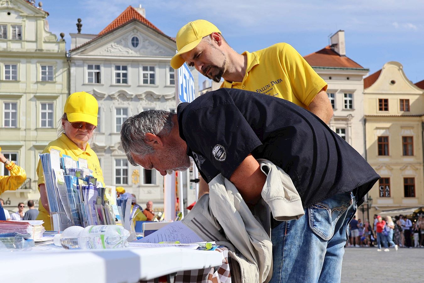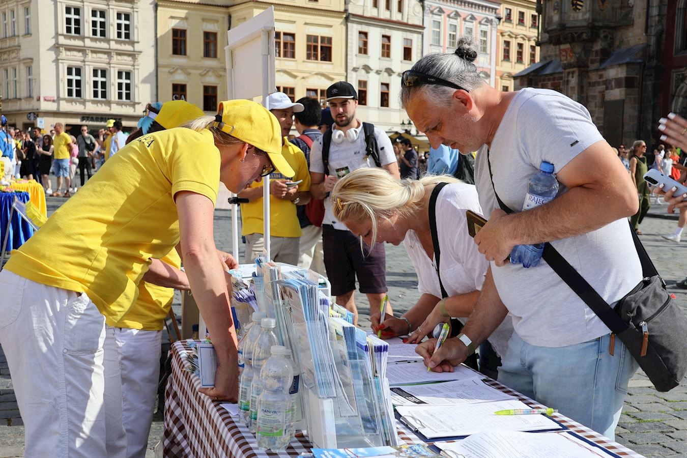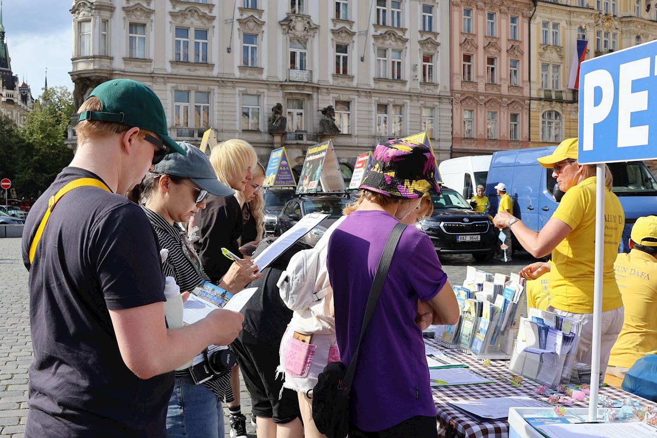 遊行結束後,隊伍回到老城廣場。在法輪大法真相展板前,很多學員在此解答路人的提問,並向民眾徵簽,籲請捷克國會,採取更多行動,共同制止迫害。