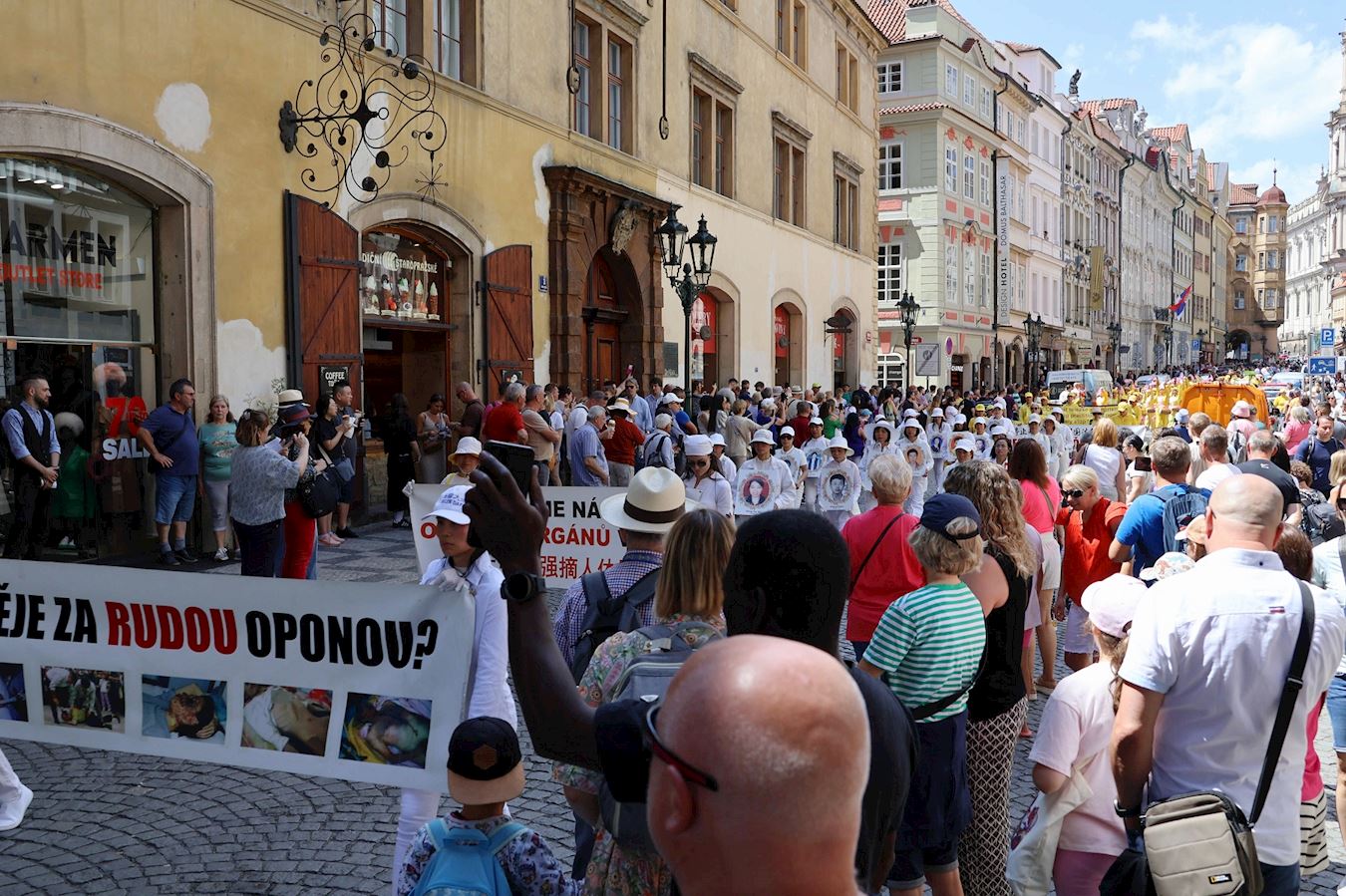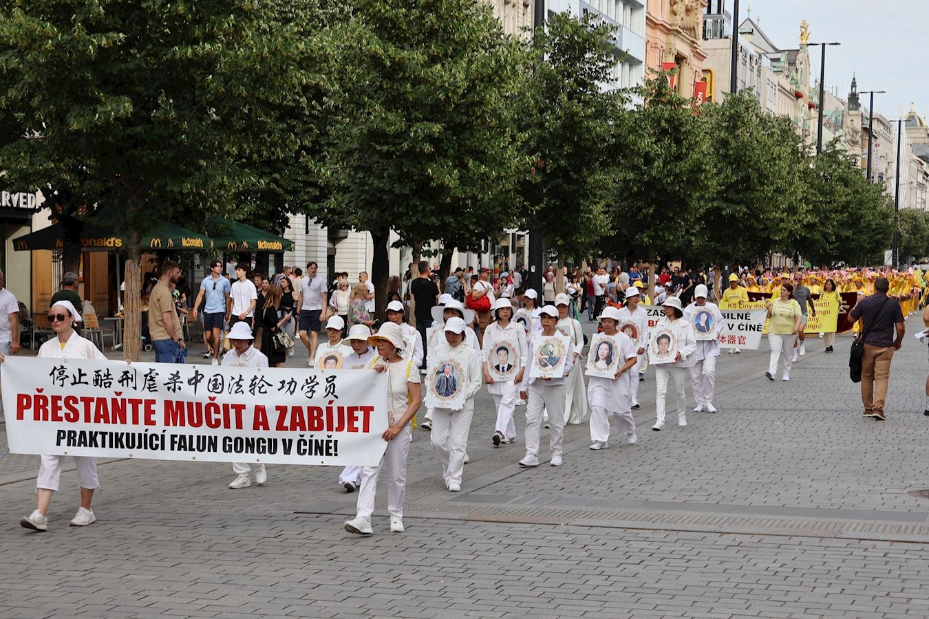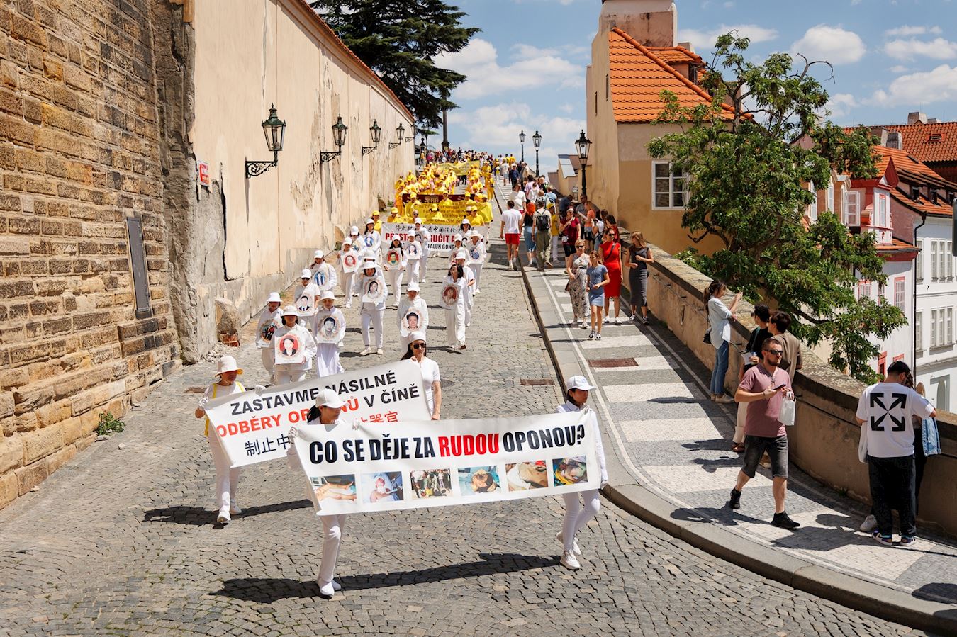 由歐洲法輪功學員發起的集會遊行活動前,學員們在演講中希望讓更多人了解法輪大法的美好,以及正在中國發生的對法輪功學員的血腥迫害。遊行從城堡廣場(Hradcany Square)出發,行經查理大橋(Charles Bridge),而後繞行城市大街小巷。