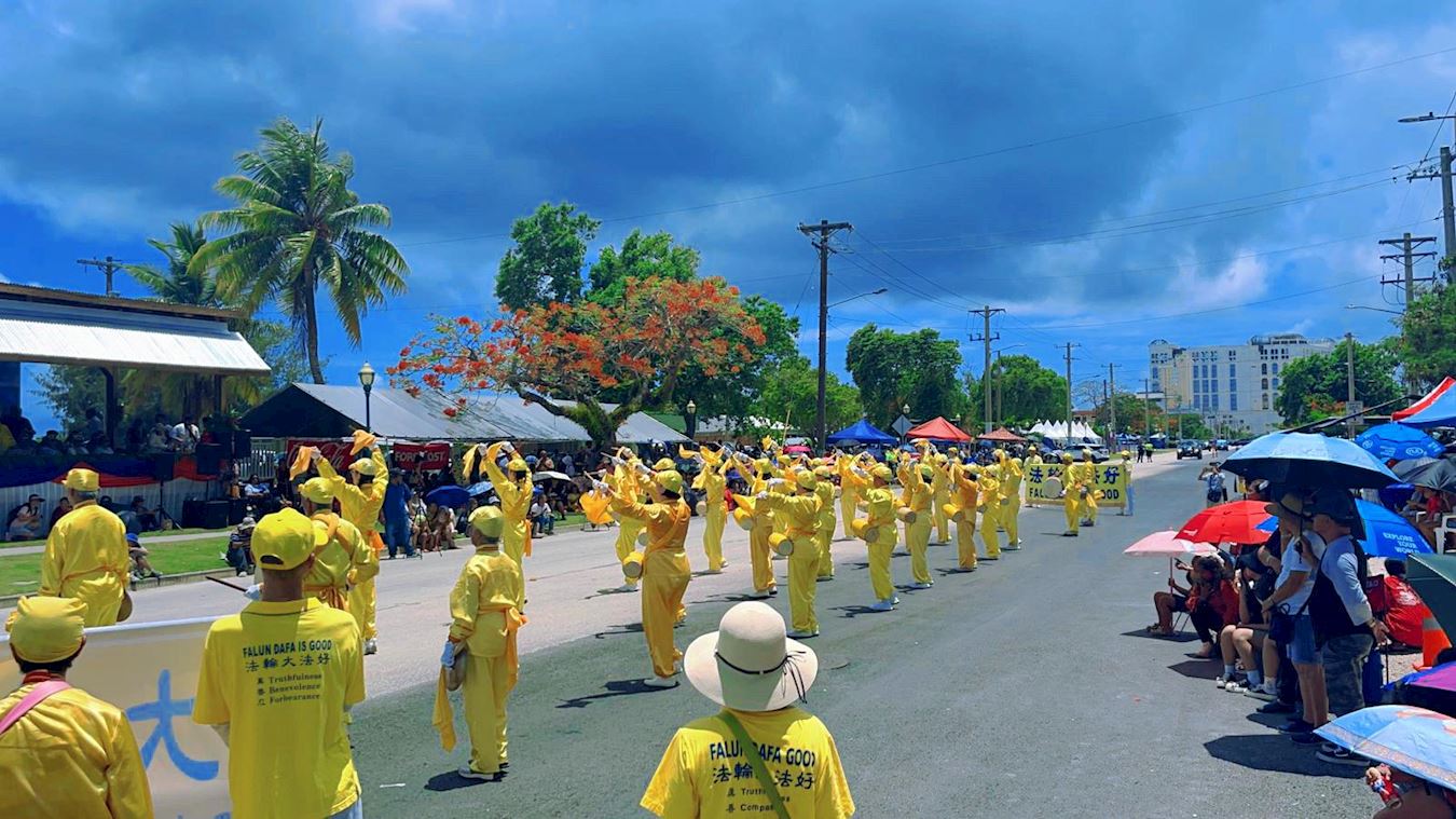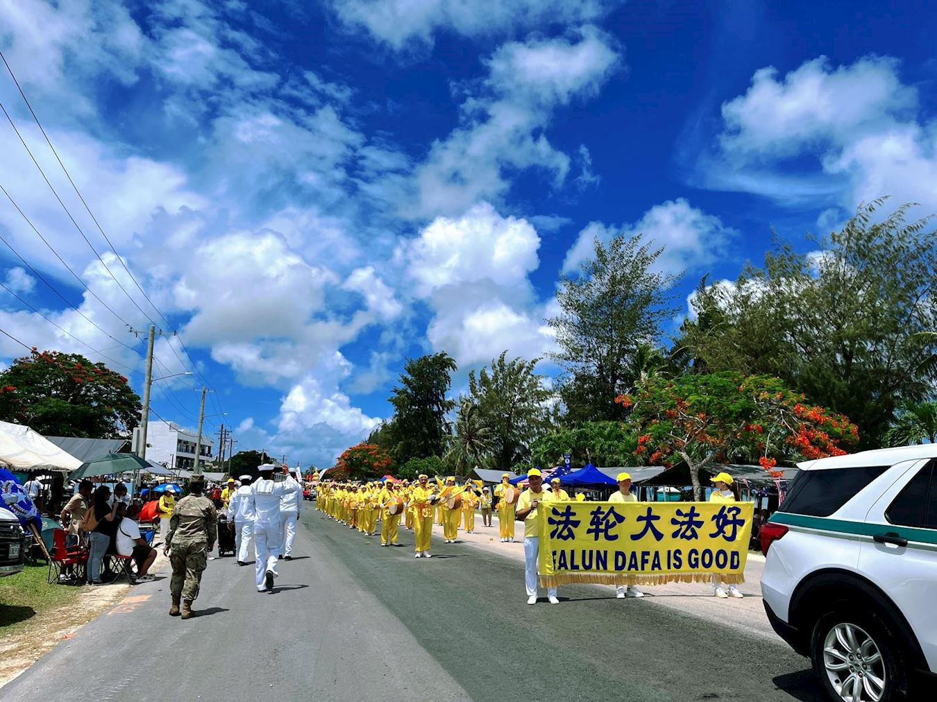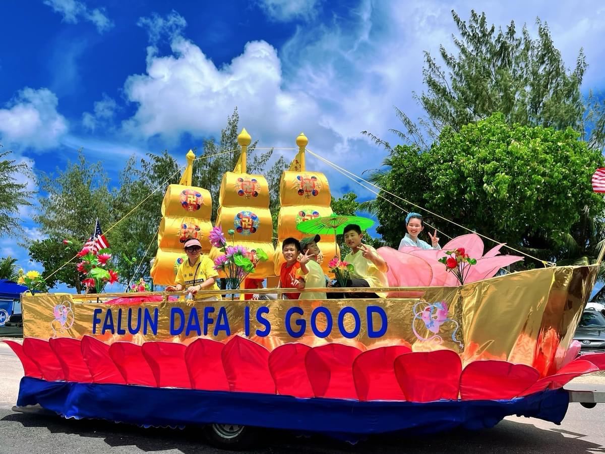 塞班島法輪功學員應邀參加了此次遊行,同時當地佛學會榮幸邀請到了台灣法輪大法腰鼓隊前往塞班,他們將大法的光明美好帶給塞班市民。上午十時,一架飛機從天空飛過,遊行在喜慶的氛圍中拉開帷幕,法輪功學員的遊行方陣由拉橫幅隊、腰鼓隊和精美法船三部份組成,隊伍色彩亮麗,鼓樂齊鳴吸引觀眾目光。法輪功學員們精神飽滿,平和樂觀,法輪功橫幅隊學員手持中英文橫幅「法輪大法好」,「世界需要真善忍」、「了解真相是得救的希望」等橫幅,向人們傳播著大法的福音,贏得觀眾喜愛和尊重。