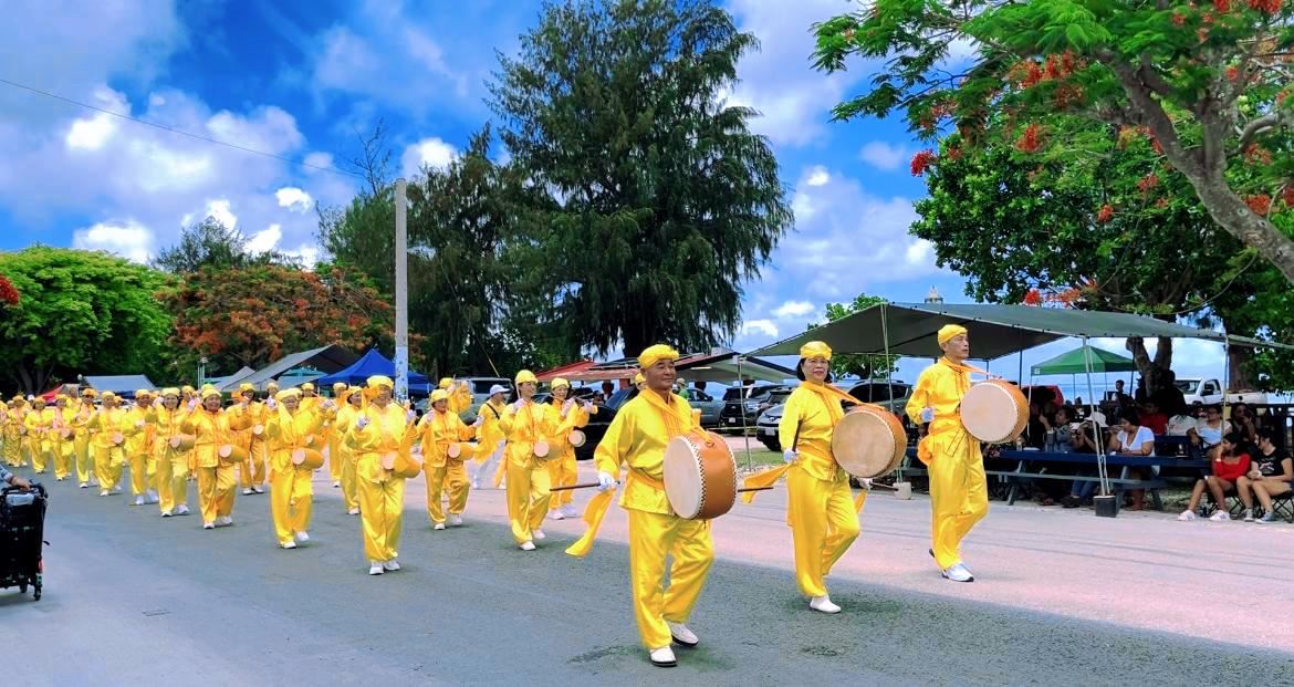 塞班與台灣法輪功學員共同組成的腰鼓隊整齊有氣勢,他們打著節奏明快的陣陣鼓點,伴隨著優美動聽的《法輪大法好》、《喜慶》樂曲,一路散發著善與祥和的能量。沿途的觀眾有的隨著鼓點節奏舞動,有的歡呼雀躍,有的駐足拍照留念,有的觀眾說:「非常喜歡腰鼓表演」,觀眾群中不時的歡呼「法輪大法好」。