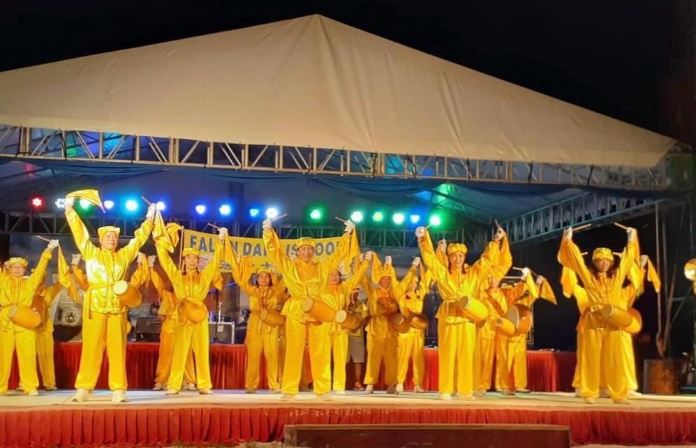 當晚七點半,台灣和塞班法輪功學員組成的腰鼓隊分別在舞台上表演了具有中國傳統特色的腰鼓。表演前主持人介紹說:「法輪大法在塞班島已弘傳二十七年,在塞班島廣為流傳受歡迎,法輪大法於一九九二年傳出,已弘傳一百多個國家和地區,使數以億計的人身心受益,法輪大法免費教功,適合各年齡段的人,法輪大法借塞班島解放日的好時機慶祝塞班島解放日快樂!純淨的心靈和高尚的道德可以帶來身體健康和美好的人生,讓我們共同記住:世界需要真、善、忍。」