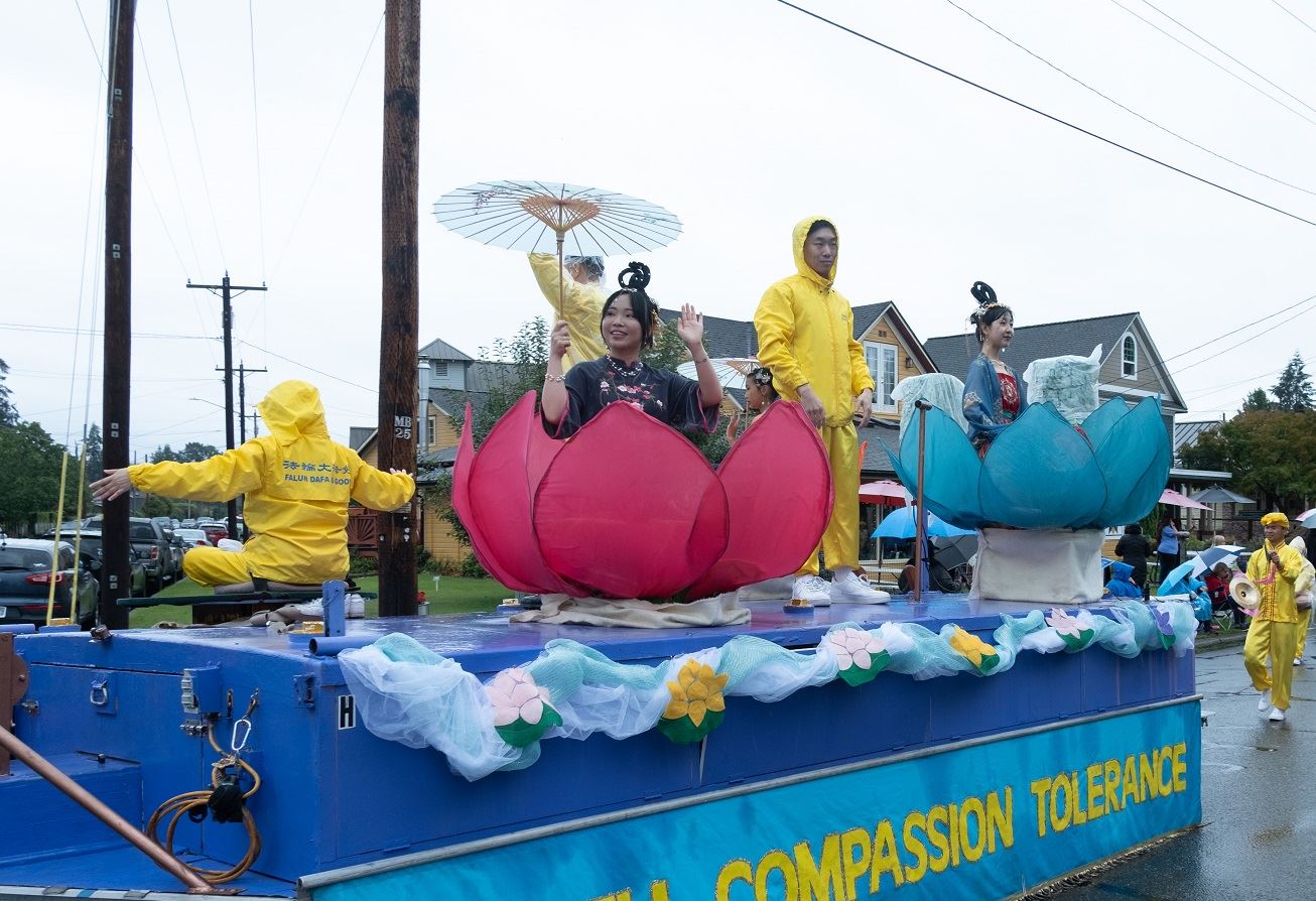 參加遊行的法輪功隊伍由法輪大法和真善忍橫幅、花車以及腰鼓隊組成。花車兩邊裝飾著舒展流動的祥雲,絢麗多彩的蓮花在花車中升起。身著煉功服和仙女服的學員們在花車上展示著法輪功功法,動作優雅從容。雖然遊行當日下著雨,但法輪功學員們的真誠參與,贏得觀眾們的陣陣掌聲