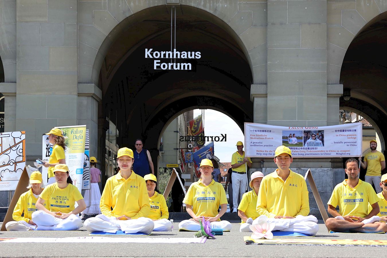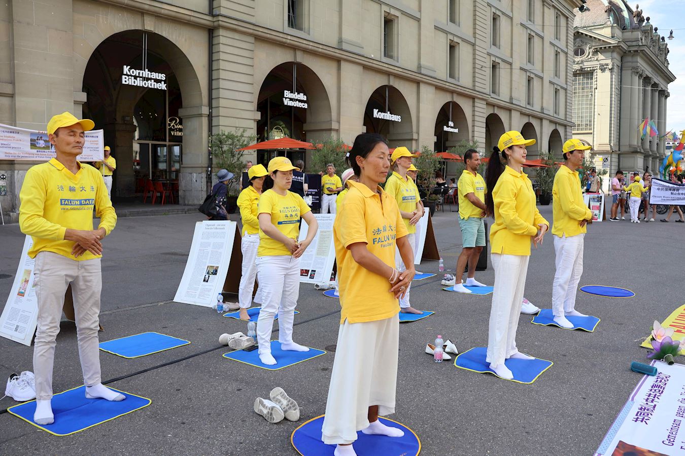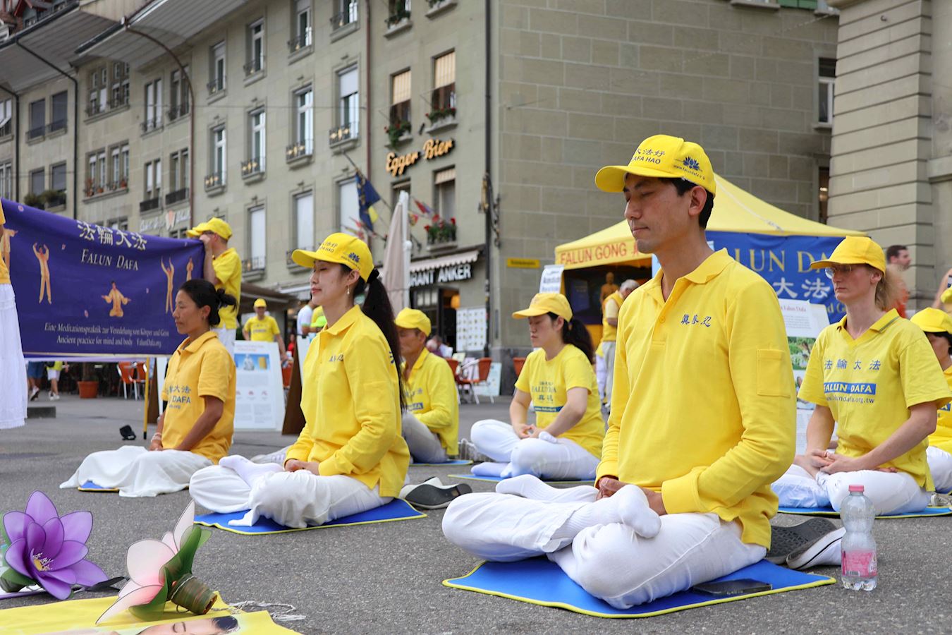 當天下午,丹尼爾和很多路人在原本空曠的廣場上看到了不同的展板及橫幅。一組身著明亮的黃T恤的男女老少隨著優美的音樂做著平緩舒展的動作。當旁邊演講開始時,他們會盤腿打坐,安靜祥和,如與周圍的車水馬龍隔離了一般。