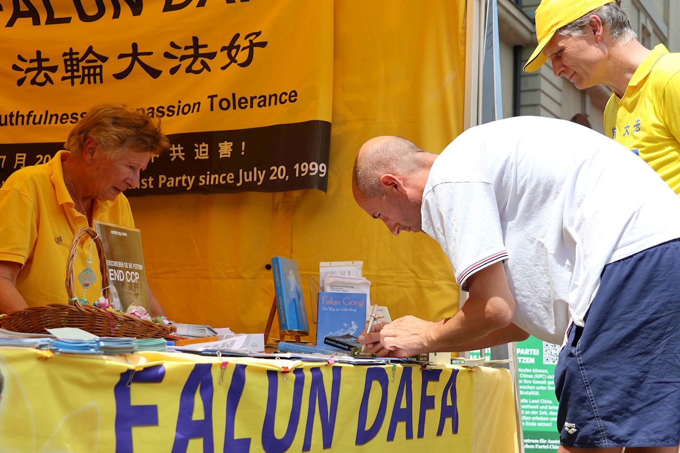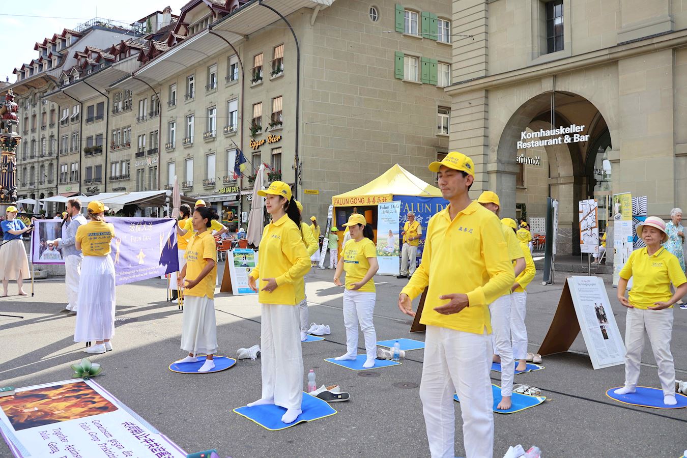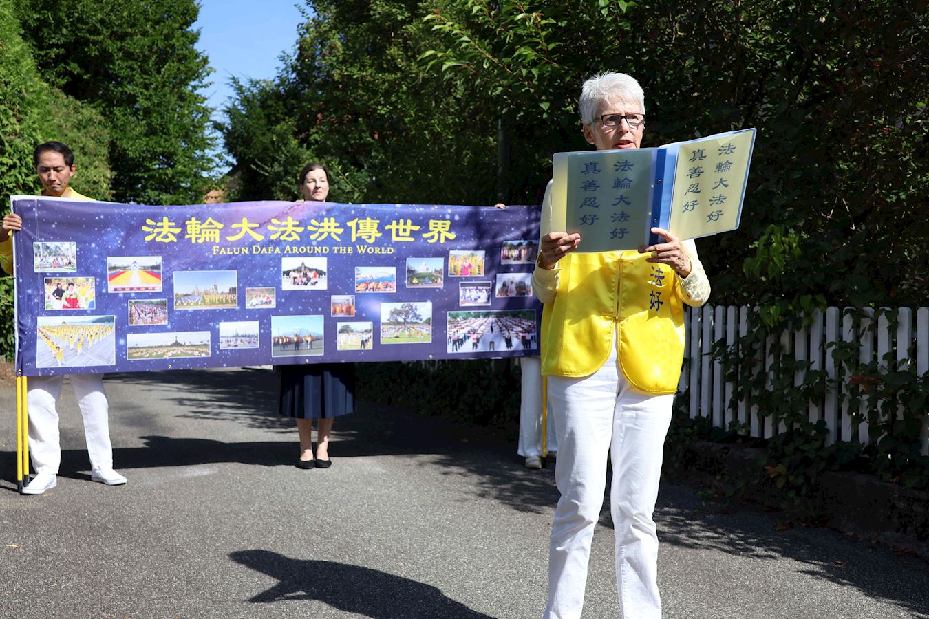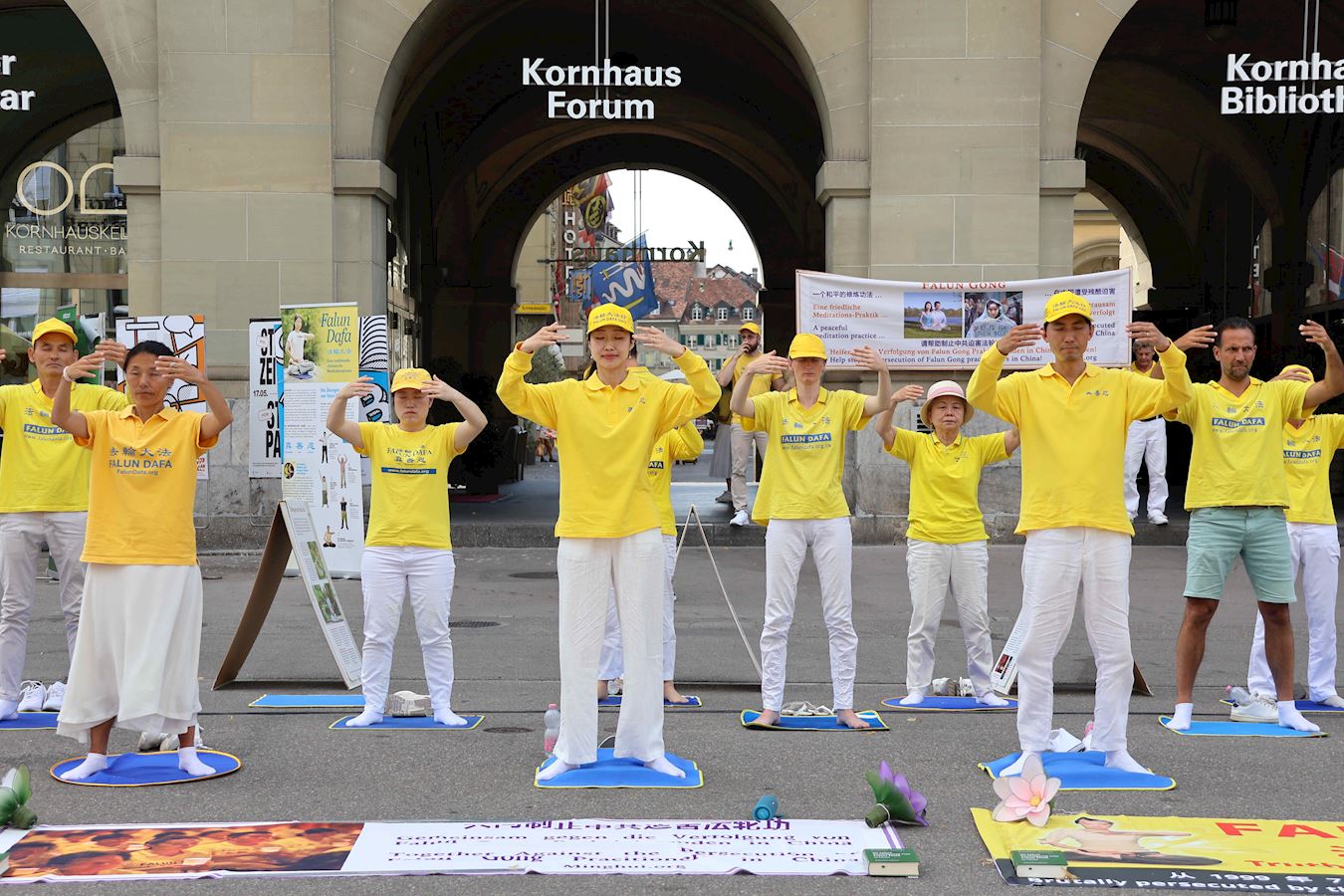 當天下午,丹尼爾和很多路人在原本空曠的廣場上看到了不同的展板及橫幅。一組身著明亮的黃T恤的男女老少隨著優美的音樂做著平緩舒展的動作。當旁邊演講開始時,他們會盤腿打坐,安靜祥和,如與周圍的車水馬龍隔離了一般。