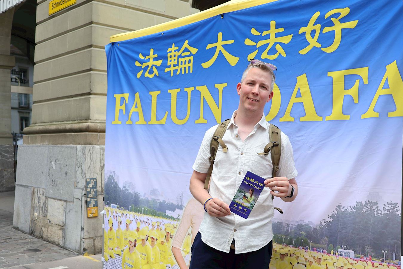 來自德國的亞歷山大﹒勞滕施萊格(Alexander Lautenschläger)是位職業軍人,正在伯爾尼度假的他看到法輪功學員的活動後格外高興。在數年前,他曾在網上知曉了法輪大法:「我覺得這個信仰傳遞的訊息和引導的方向非常吸引人,是如此地祥和,美妙。我對法輪功有著非常正面的印象,其中特別提出了對人性及社會非常重要的點,非常正面,我很喜歡。」