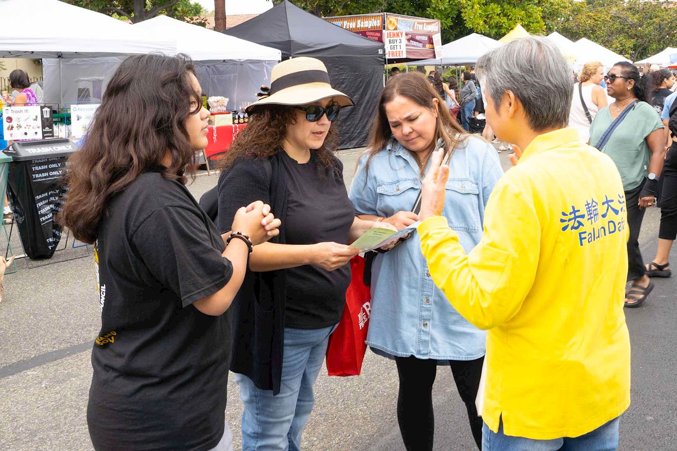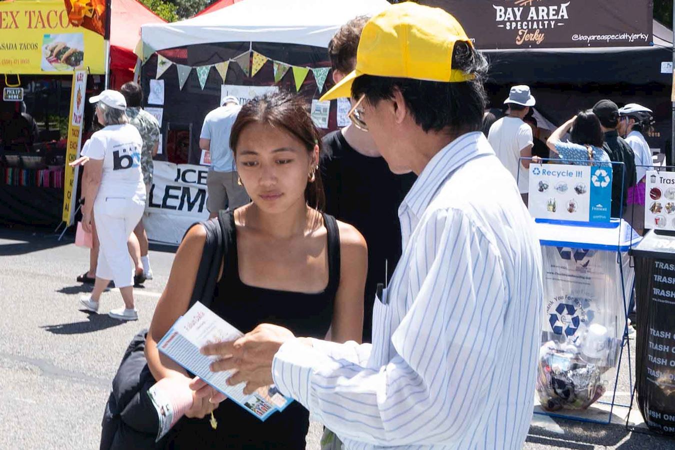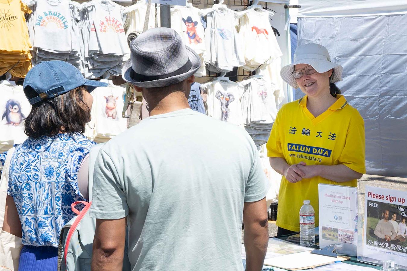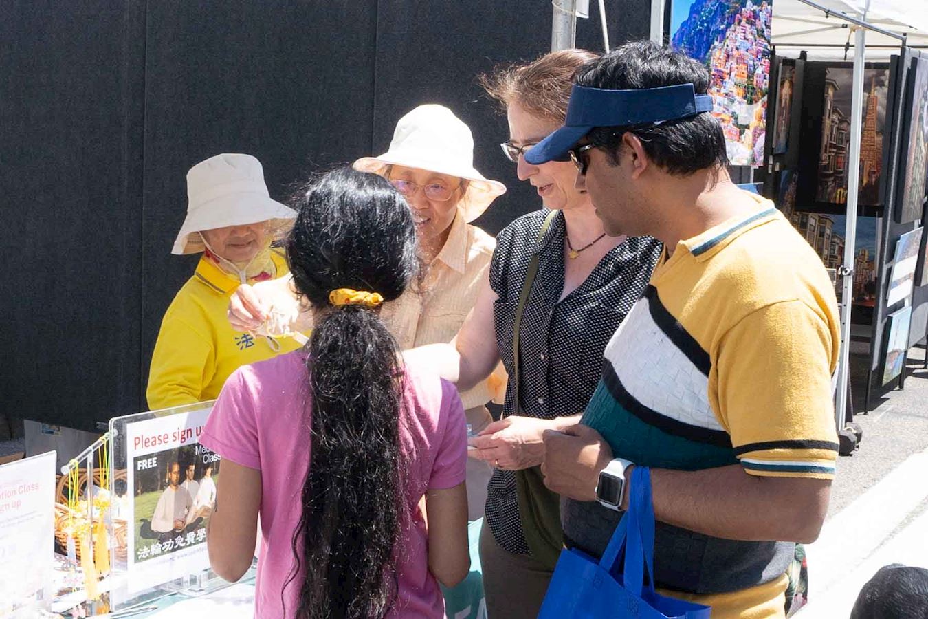 喬(Joe)和太太辛迪(Cindy)經過法輪功展位時,驕傲地說,他們上個月在舊金山看到了法輪功學員的遊行。喬說,「我在七月二十日看到了法輪功學員在舊金山的遊行,隊伍很長,非常壯觀,他們在抗議中共對法輪功的迫害,我知道中共是殘暴的,中共甚至不讓人有思想自由。」