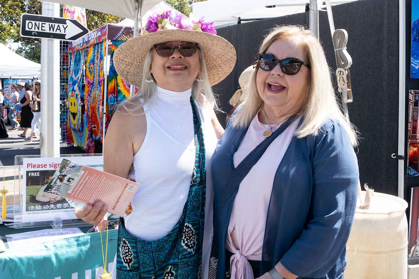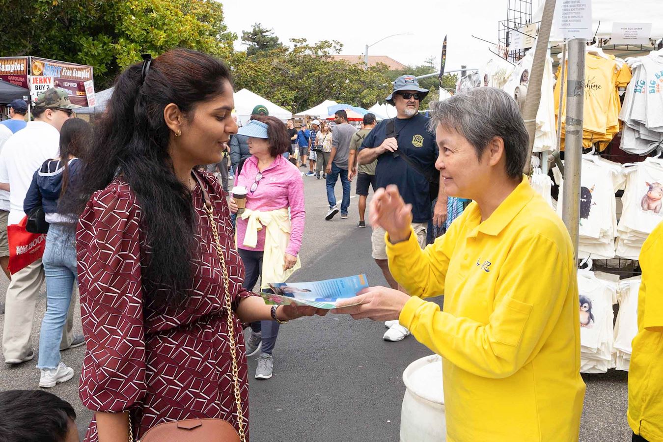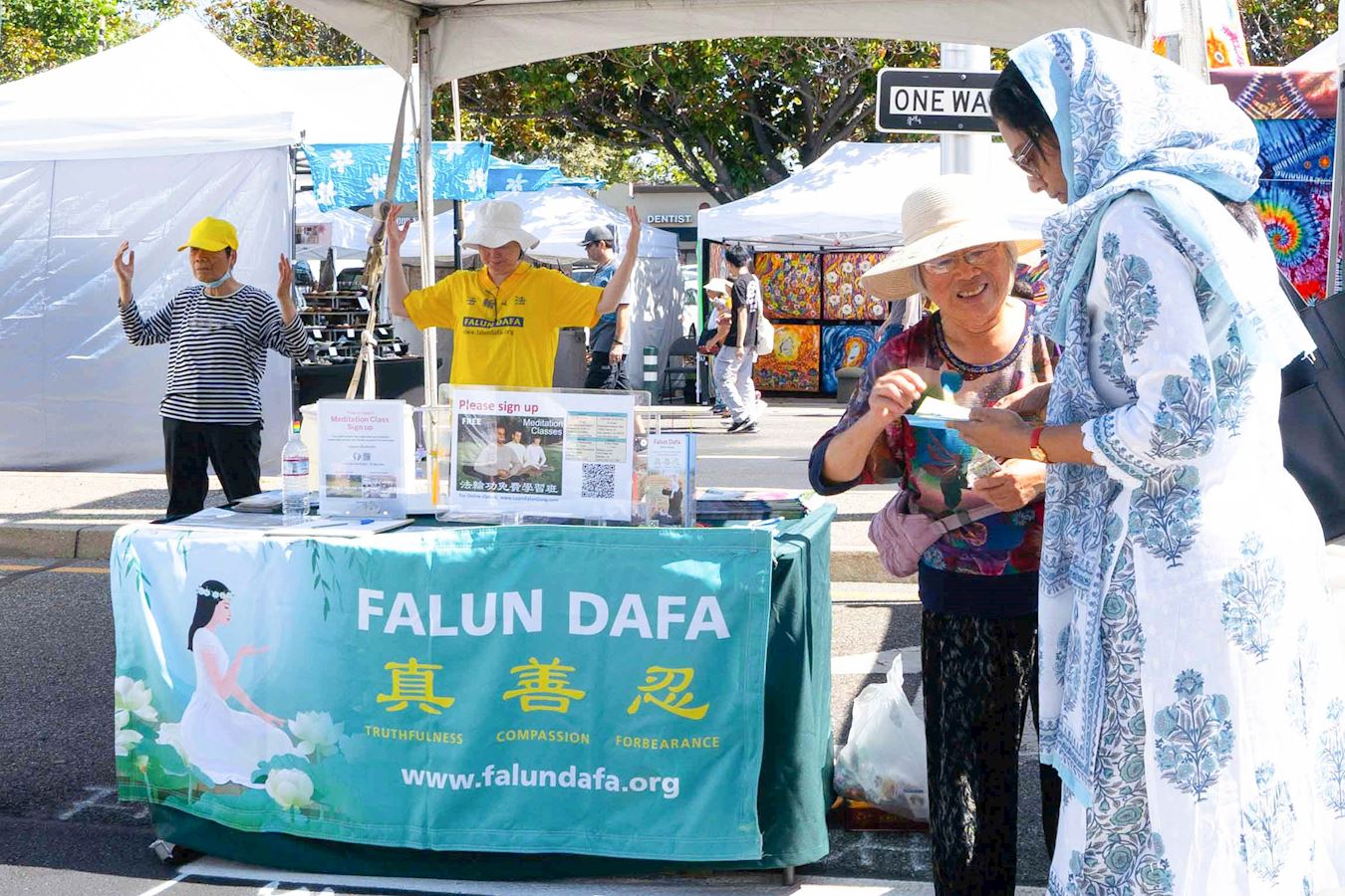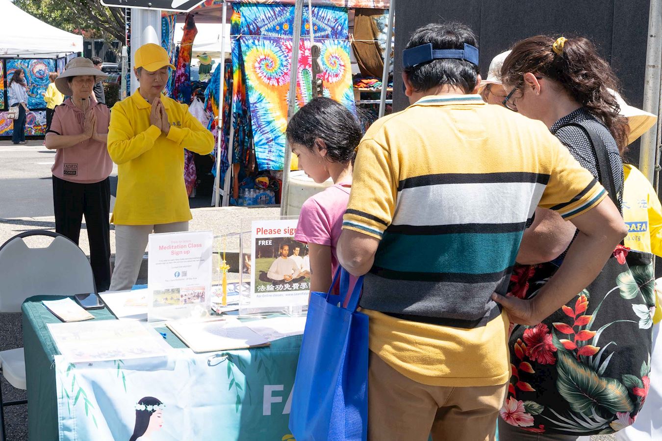 喬(Joe)和太太辛迪(Cindy)經過法輪功展位時,驕傲地說,他們上個月在舊金山看到了法輪功學員的遊行。喬說,「我在七月二十日看到了法輪功學員在舊金山的遊行,隊伍很長,非常壯觀,他們在抗議中共對法輪功的迫害,我知道中共是殘暴的,中共甚至不讓人有思想自由。」