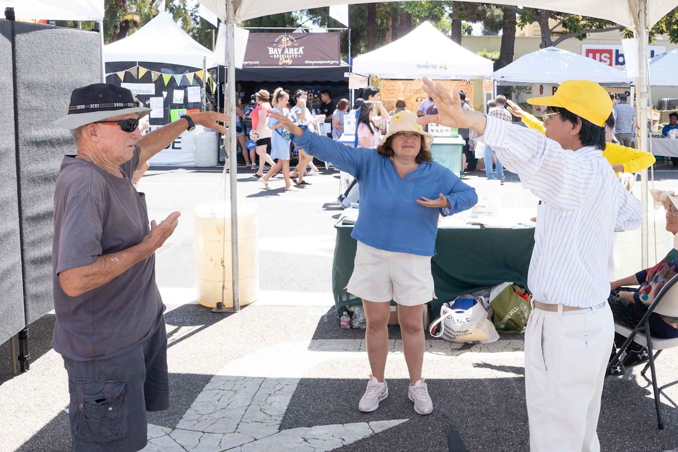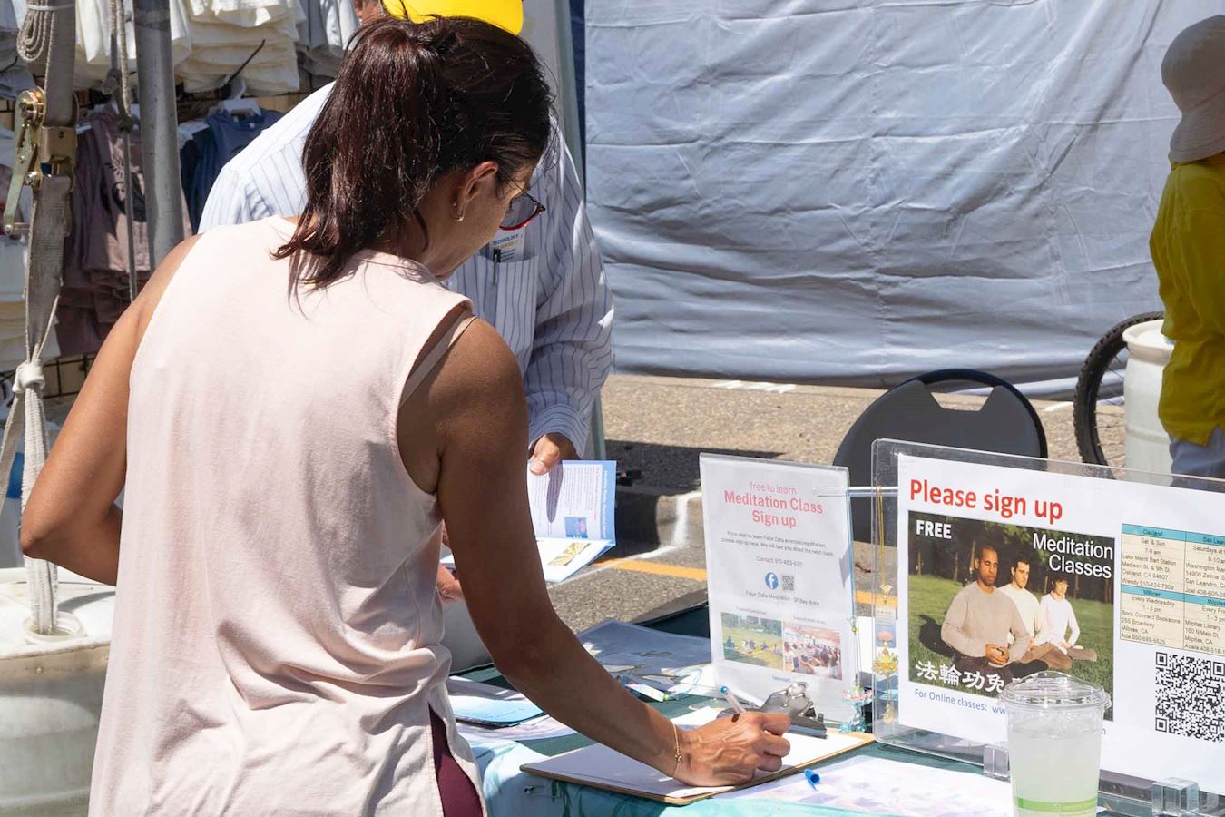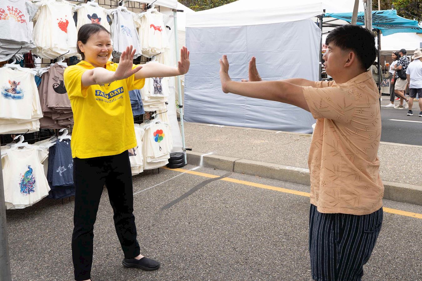 當天,不少人了解到修煉法輪功可以幫助緩解壓力,放鬆身心後,當場學功,並親身感受學功後帶來的神奇功效。