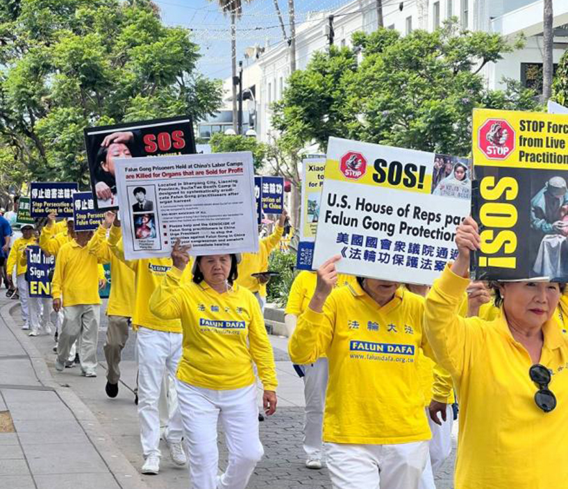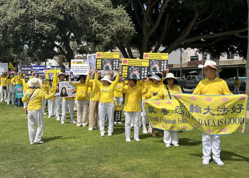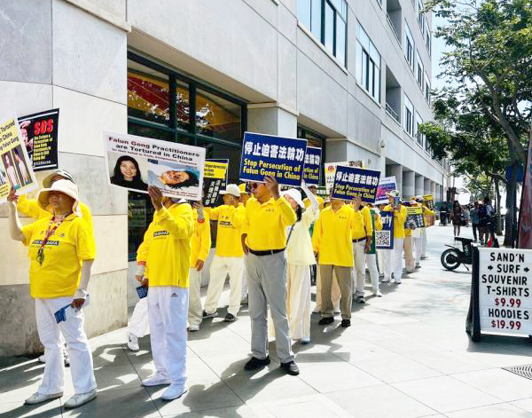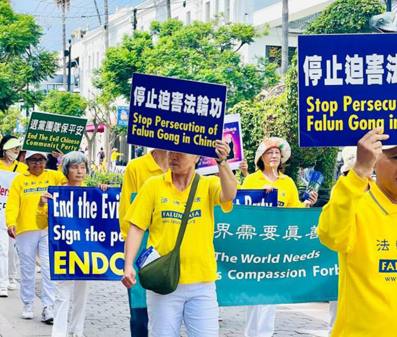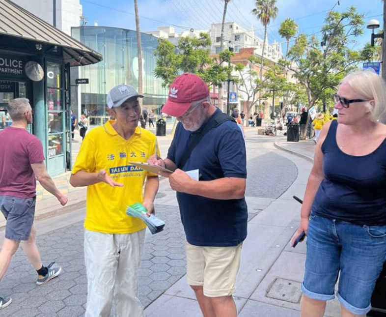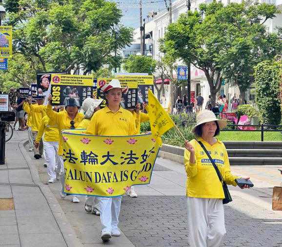 學員齊聚在聖莫妮卡(Santa Monica)碼頭及商業區街道舉行遊行,穿著金黃色衣服的學員就像一道靚麗的風景線,向來自世界各地的人講真相,許多遊客豎起大拇指,表示很震撼,也有不少遊客拿出手機拍照、錄像。