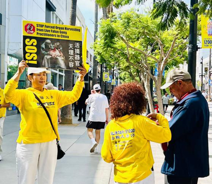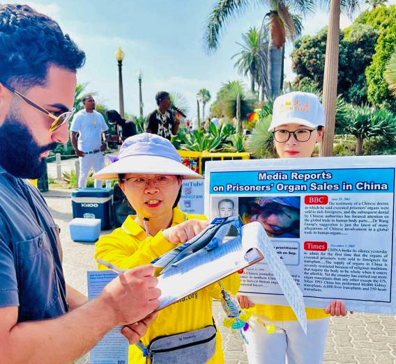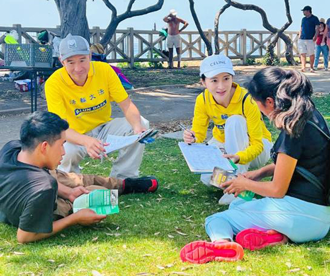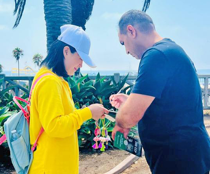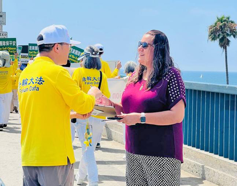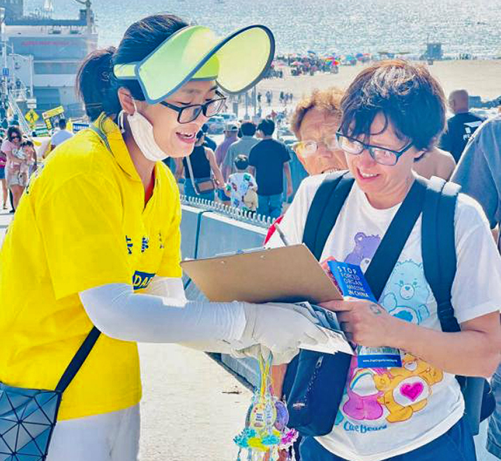 二零二零年從中國來到美國的胡女士,從開始聽到法輪功就害怕,到明白真相後走入修煉,現在週末只要有時間,就會帶著她的兒子來海邊參加弘法和徵簽,她的兒子是她的小翻譯。