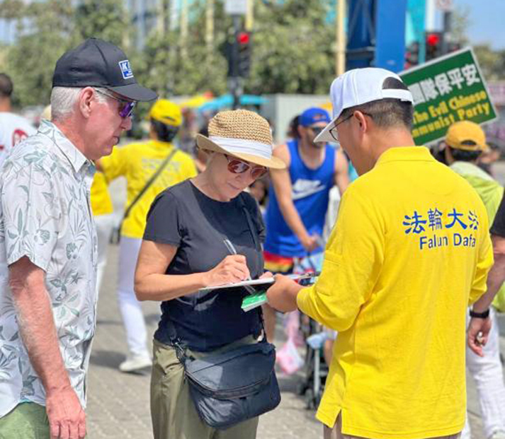 楊先生修煉法輪功十五年,他剛來美國不久,他表示他有幸參加了這次活動,隨著遊行的隊伍,他向遊客發真相資料,並徵集支持法輪功反迫害的簽名。