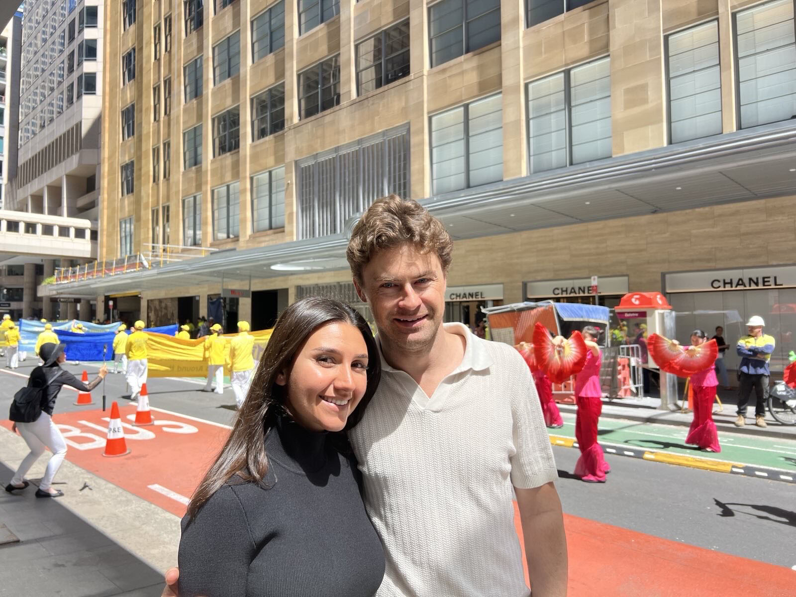 ![]() 圖20:悉尼兩位律師詹姆斯(右)和澤拉第一次觀看法輪功學員的遊行,印象深刻。 |