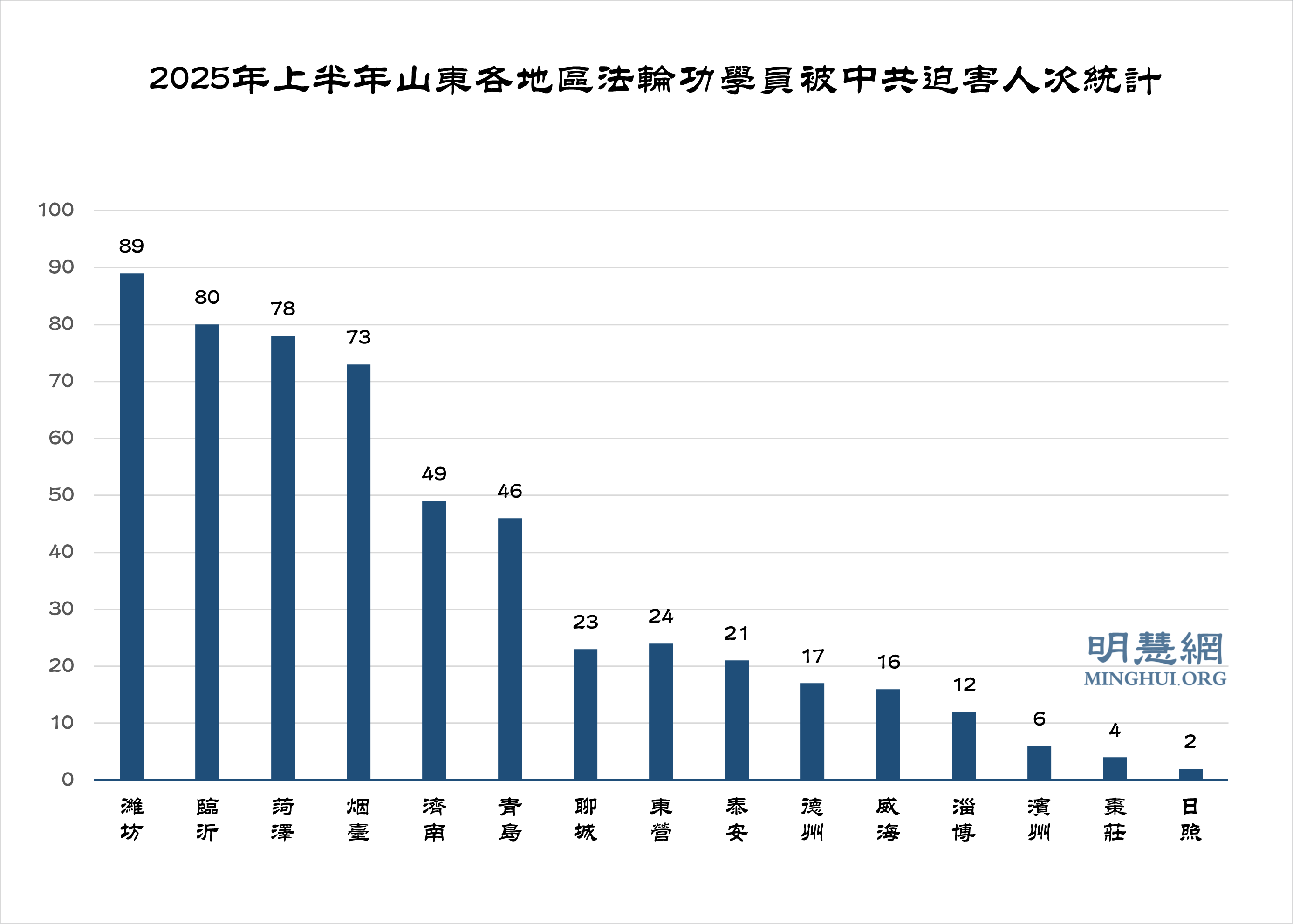 ![]() 圖1:2025年上半年山東各地區法輪功學員被中共迫害人次統計 |