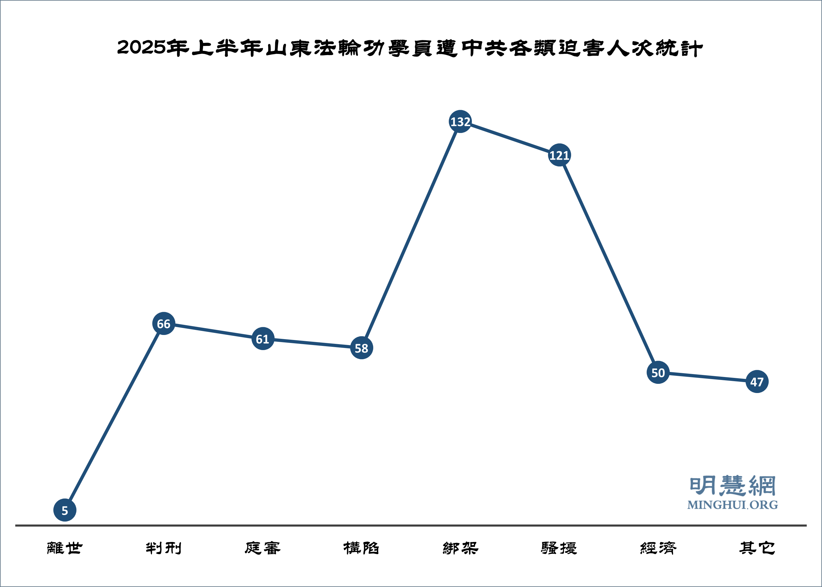 ![]() 圖2:2025年上半年山東法輪功學員遭中共各類迫害人次統計 |