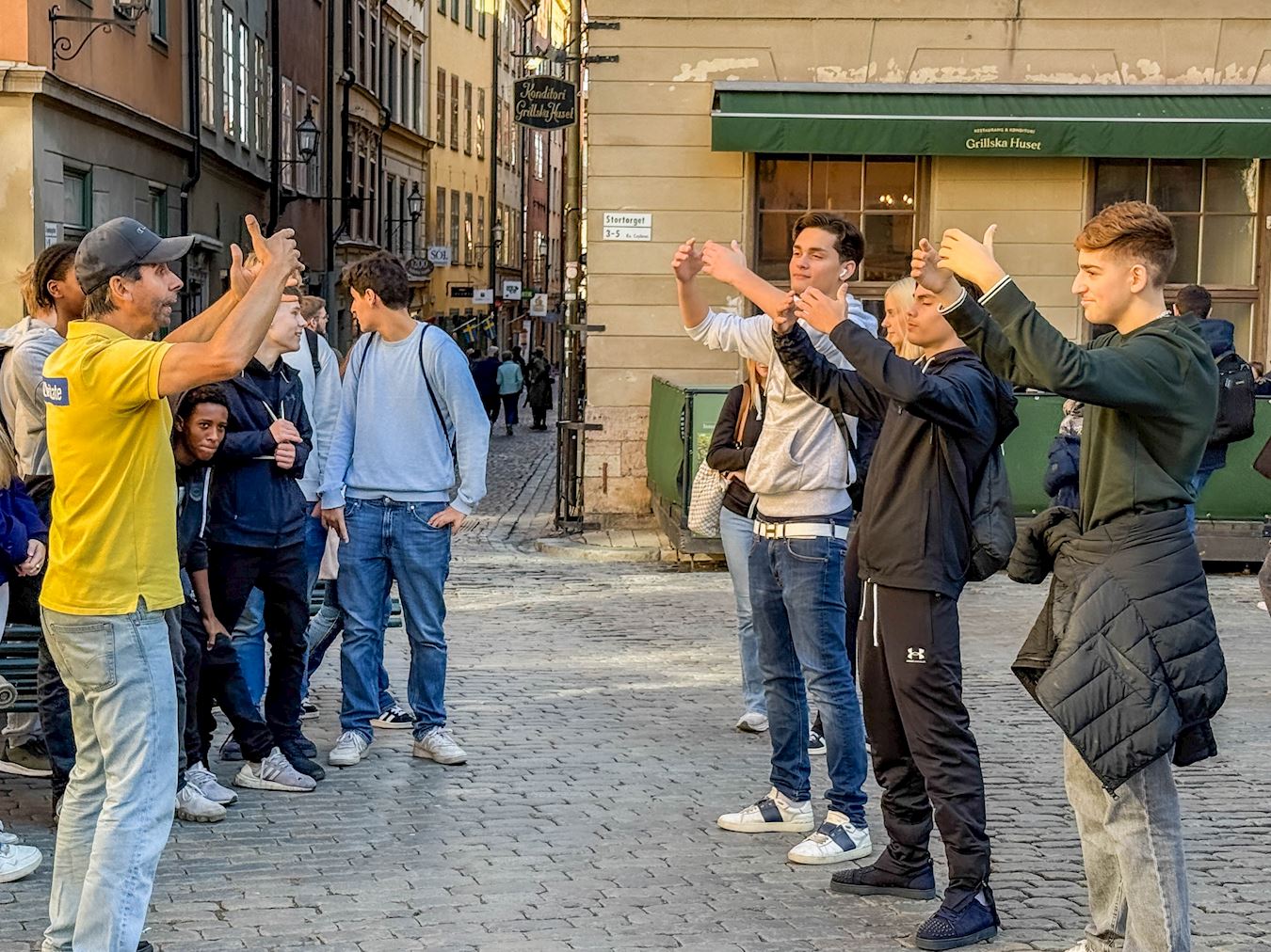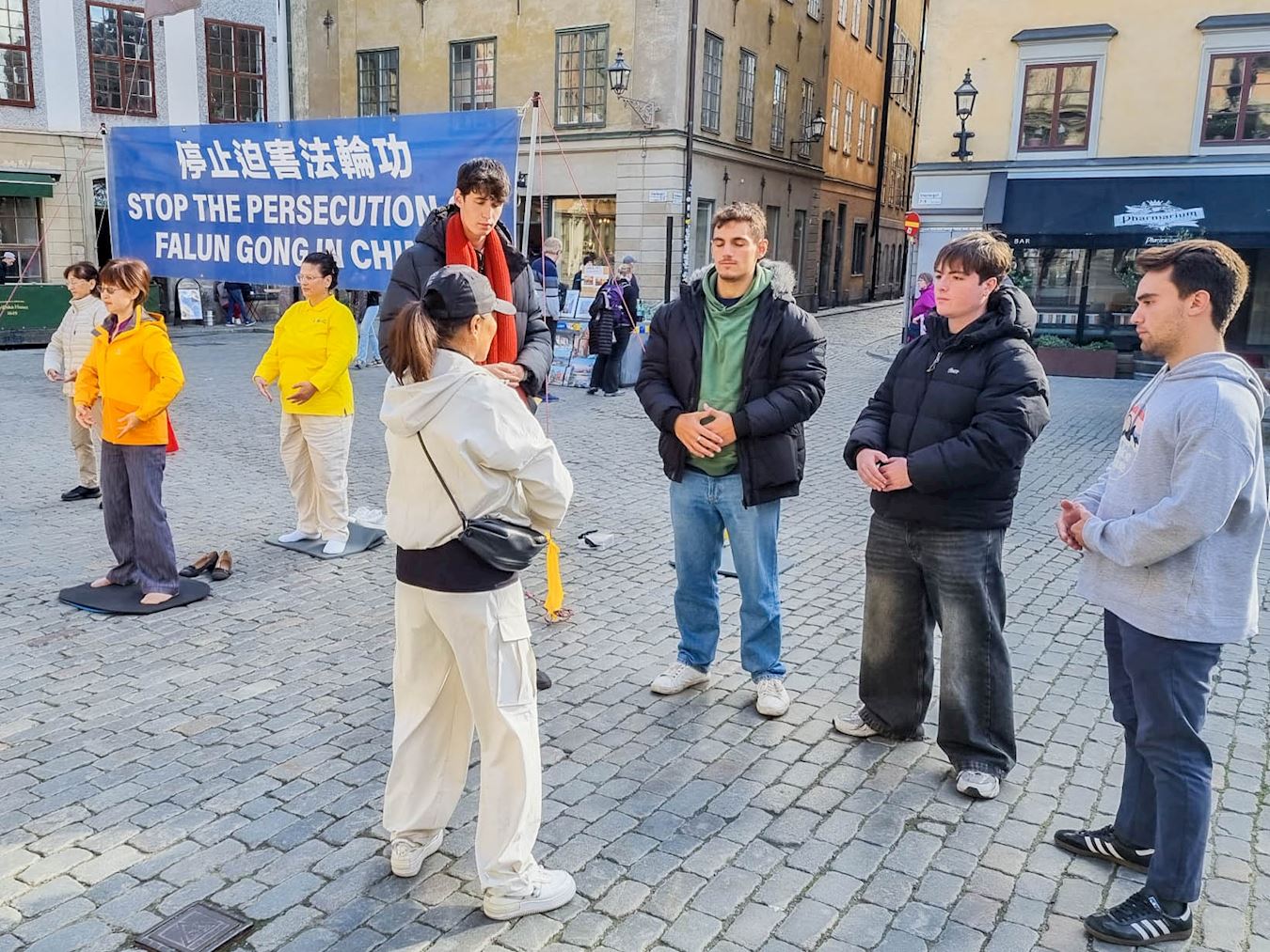 面對諾貝爾博物館前小廣場上川流不息的人群,法輪功學員伴隨著悠揚的煉功音樂展示五套功法,以和平理性的方式講述著法輪功真相,揭露中共在中國境內境外迫害法輪功的罪行。很多人被醒目的橫幅、展板,寧靜祥和的煉功場面所震撼。人們都主動接資料、觀看展板或與學員交談,得知中共採取各種卑鄙流氓手段迫害修煉真、善、忍的人,紛紛譴責中共獨裁暴政並簽名支持反迫害,不少人對功法感興趣,當場就學煉功動作。