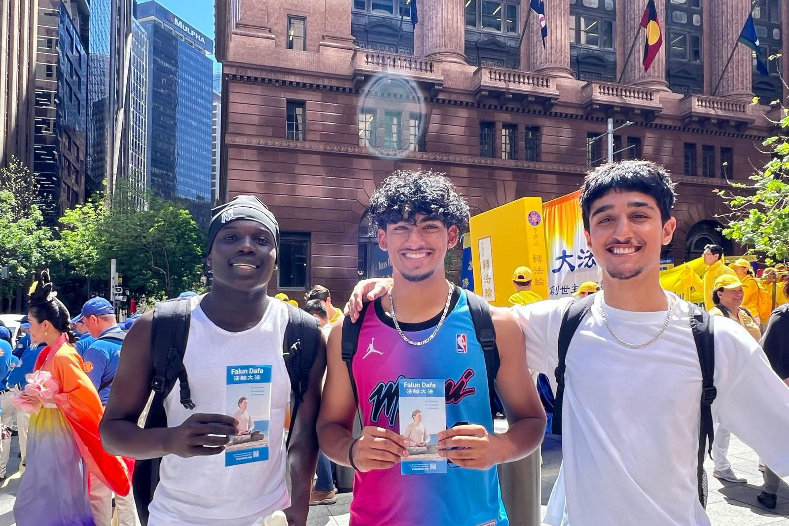 ![]() 圖12:十月十一日,學生塔維安﹒利馬(中)和穆罕默德﹒阿卜杜勒﹒阿齊茲(右)與同伴在悉尼市中心法輪功學員遊行現場合影。 |