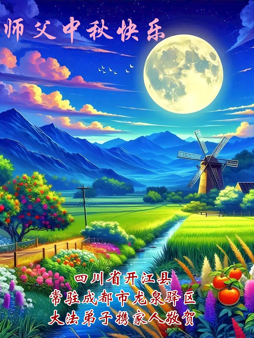 四川省達州市開江縣常駐成都市龍泉驛區大法弟子攜家人恭祝師父中秋快樂!