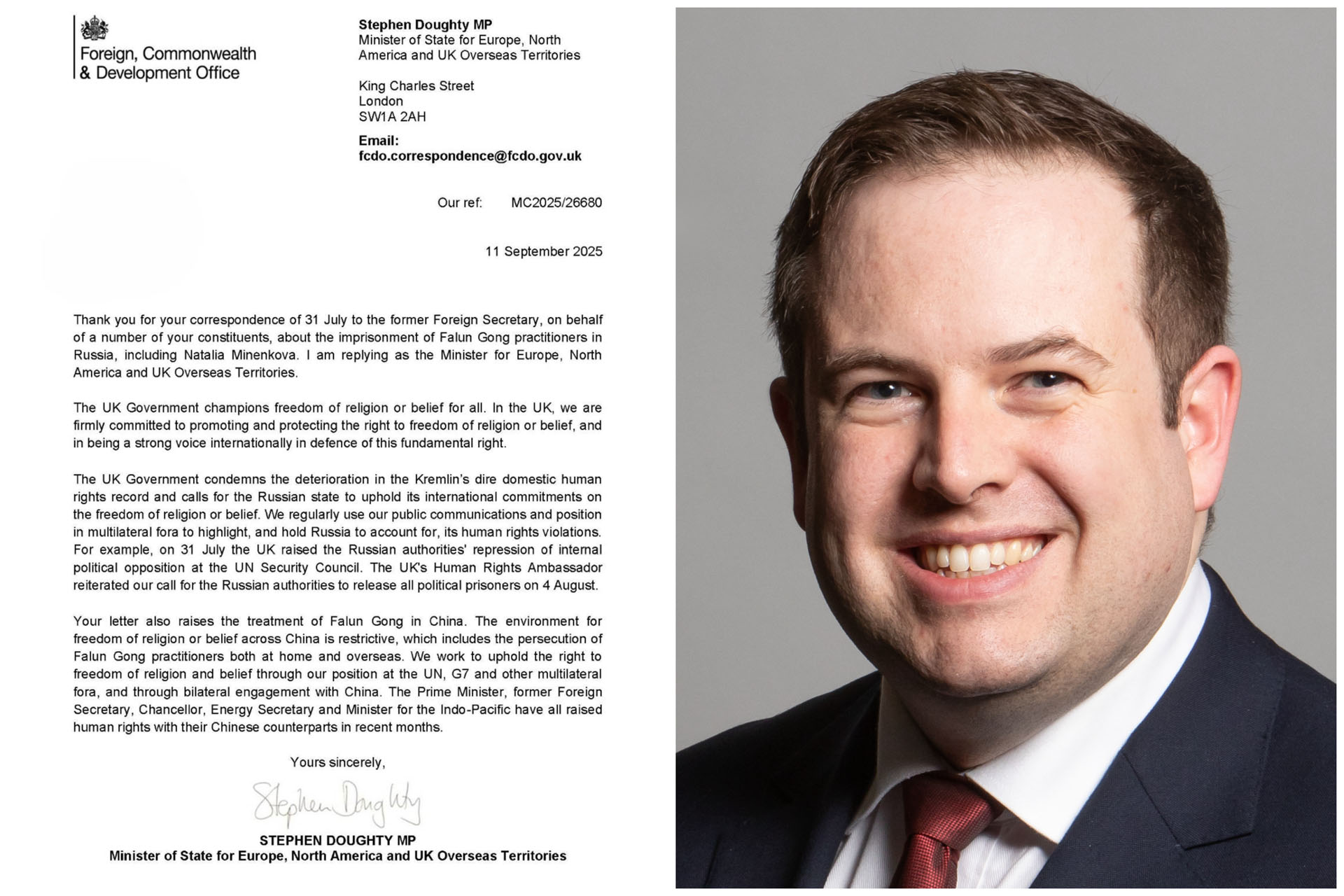 英國負責歐洲、北美及英國海外領土的國務大臣斯蒂芬﹒道蒂(Stephen Doughty)議員在信中表示:「英國政府一貫倡導人人享有宗教或信仰自由。在英國,我們堅定致力於促進和保護宗教或信仰自由的權利,並在國際上為這一基本權利發出強有力的聲音。」