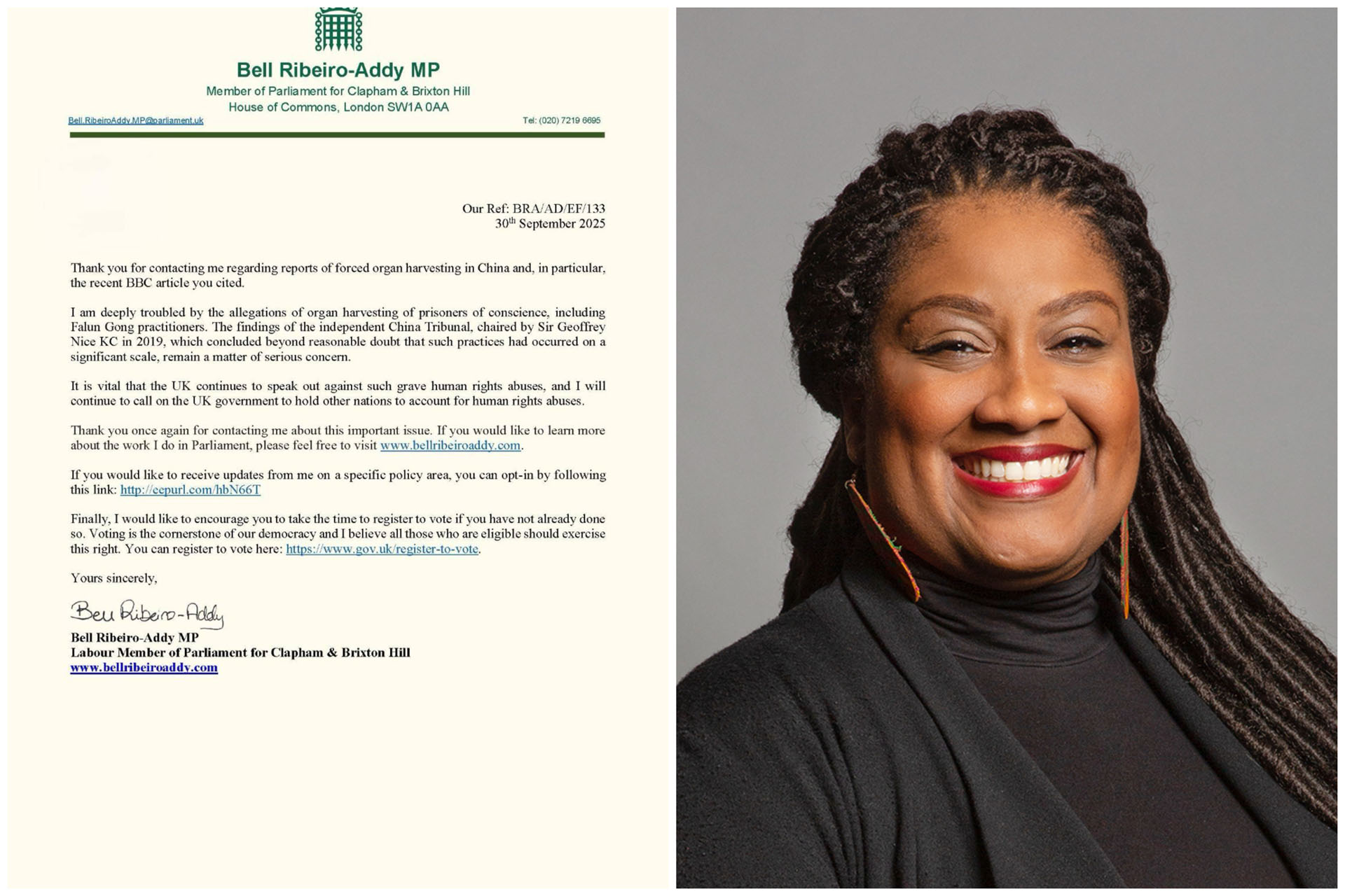 國會議員貝爾﹒裏貝羅-阿迪(Bell Ribeiro-Addy)在信中表示:「關於針對良心犯(包括法輪功學員)遭受器官摘取的指控,我感到極為不安。由傑弗裏﹒奈斯爵士 KC 在2019年主持的獨立『中國法庭』的調查結果認定──在毫無合理懷疑的情況下──這種行為確實在大規模發生。這一結論至今仍令人嚴重關切。」