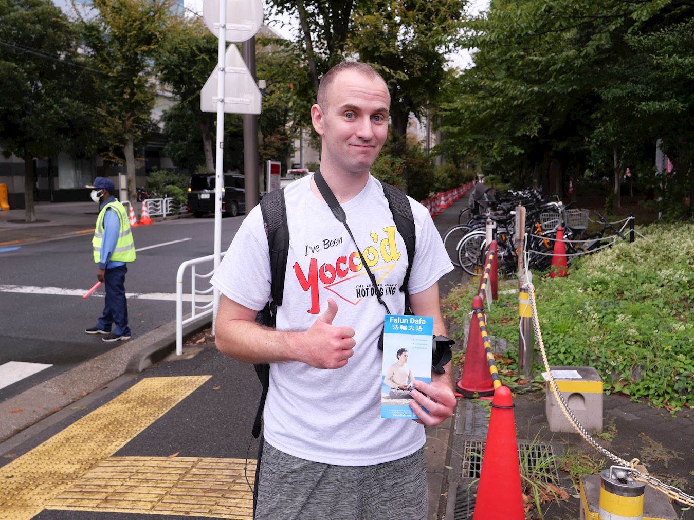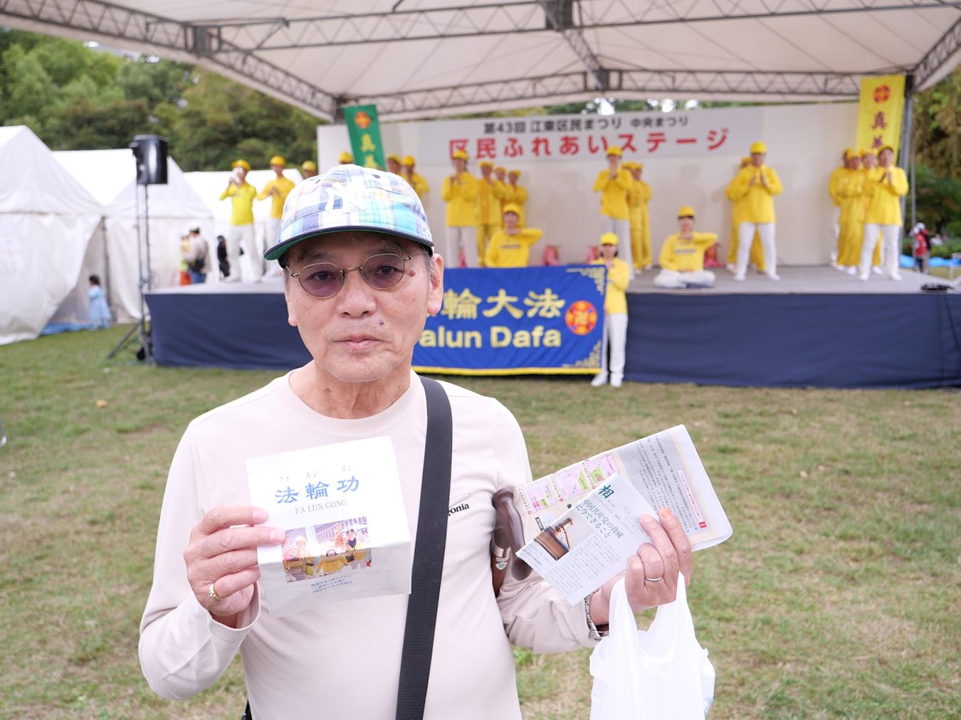 觀看完學員們的舞台表演後,山下部先生說:「我家附近有個公園,每天早上都有法輪功學員在打坐。我認為,法輪功受到中共的迫害是個大問題。昨天我也來參加了活動,並拿到了法輪功的資料閱讀。學員們經常在主要車站派發資料,所以我也因此了解了關於活摘的真相。」