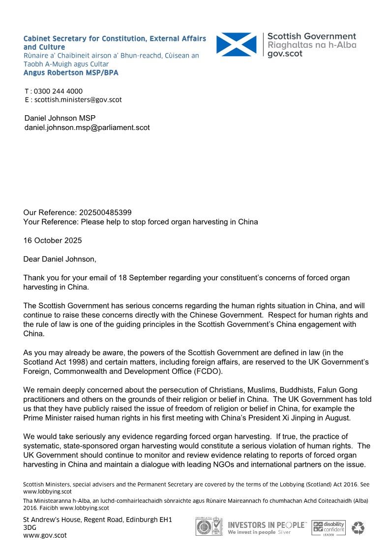 蘇格蘭政府負責憲法、對外事務及文化事務內閣大臣安格斯﹒羅伯遜(ANGUS ROBERSTON)在十月十六日回覆蘇格蘭議會議員丹尼爾﹒約翰遜(Daniel Johnson)的信中表示:「蘇格蘭政府對中國的人權狀況深表關切,並將繼續直接向中國政府提出這些問題。尊重人權和法治是蘇格蘭政府與中國交往的指導原則之一。」