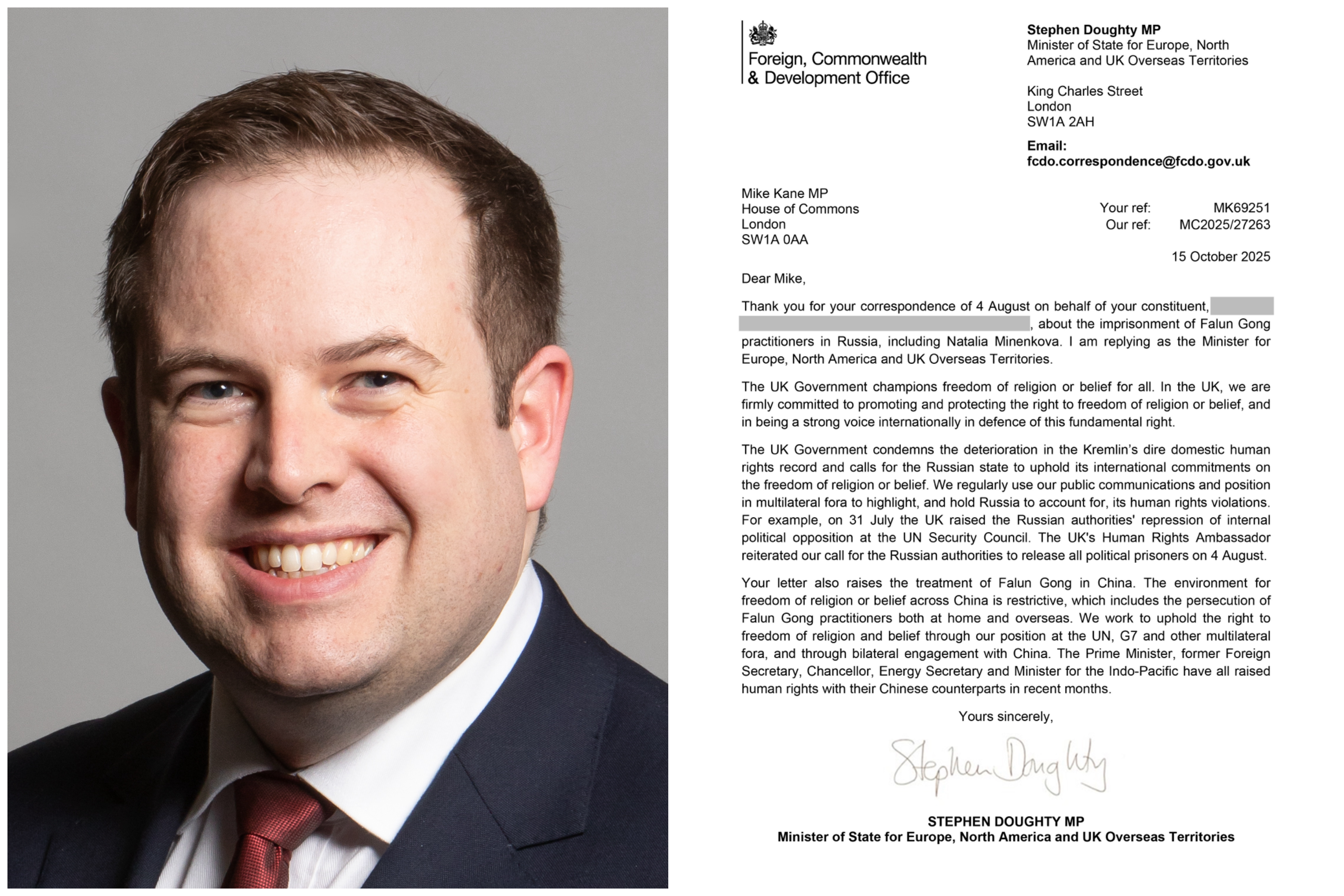 英國外交部負責歐洲、北美及英國海外領地事務國務部長斯蒂芬﹒道蒂(Stephen Doughty )議員在十月十五日回覆國會議員邁克﹒凱恩(Mike Kane)的信中表示: