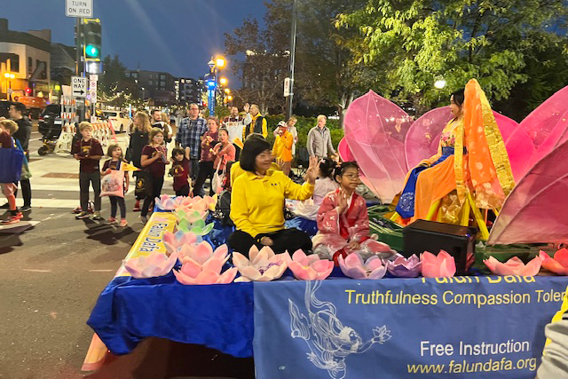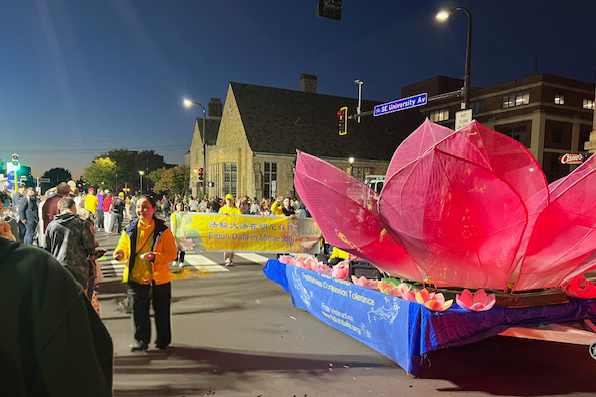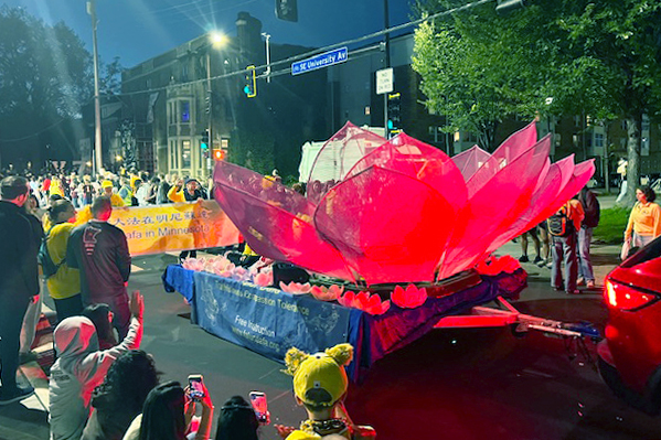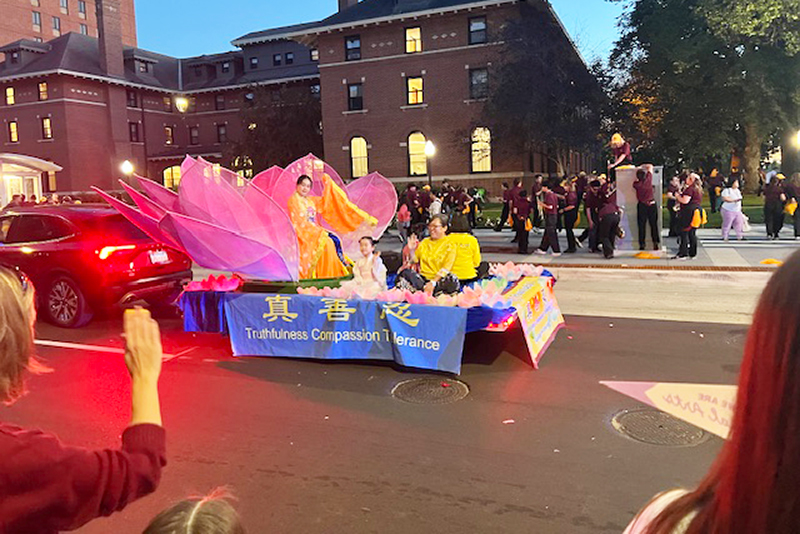華燈初上,返校日遊行於傍晚六點半開始。法輪功俱樂部隊伍在優雅的《普度》音樂聲中緩緩前行,巨大的粉色蓮花花車上,身著漢服的小女孩和唐裝的仙女熱情的和觀眾招手,花車前後有俱樂部成員拉著法輪功的橫幅,花車兩旁還有學員給沿街觀眾贈送小蓮花和書籤。俱樂部成員們美麗祥和的姿態受到了沿街觀眾的讚歎。